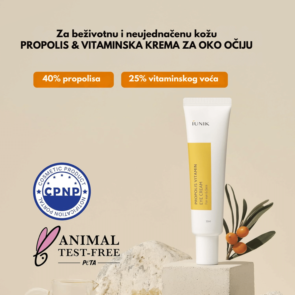 iUNIK Propolis Vitamin Eye Cream je hranljiva krema za predeo oko očiju koja pomaže u posvetljavanju i zaglađivanju kože. Kombinacija propolisa i vitamina doprinosi hidrataciji i smanjenju znakova umora.