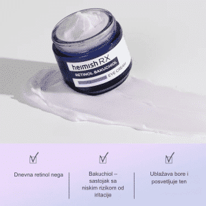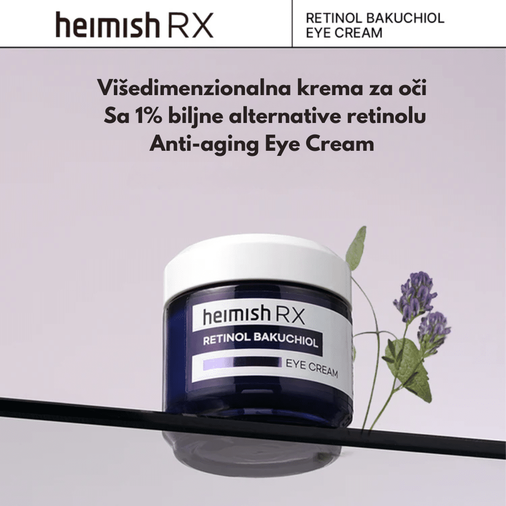 Heimish Rx Retinol Bakuchiol Eye Cream 30ml je specijalizovana krema za područje oko očiju koja kombinuje 0,01% retinol i 1% bakuchiol, kao i 5% niacinamida za borbu protiv znakova starenja, poput finih linija, tamnih krugova i otečenosti. Metalni aplikator pruža efekat hlađenja, smanjuje natečenost i poboljšava mikrocirkulaciju, ostavljajući oči osveženim i mladalačkim. Retinol je poznat po svojim snažnim anti-aging svojstvima, podstičući obnovu kože i smanjujući pojavu bora, dok bakuchiol, prirodna alternativa retinolu, deluje nežno na kožu i poboljšava tonus bez izazivanja iritacija. Ova krema je obogaćena hijaluronskom kiselinom koja pruža intenzivnu hidrataciju, čineći kožu oko očiju glatkom, mekom i osveženom. Heimish Rx Retinol Bakuchiol Eye Cream je savršena za osetljivo područje oko očiju, jer ne samo da poboljšava izgled finih linija i tamnih krugova, već i pruža zaštitu od oksidativnog stresa, čineći kožu zdravijom i revitalizovanijom.