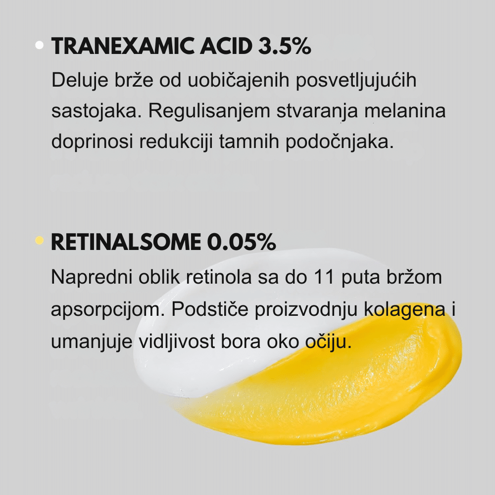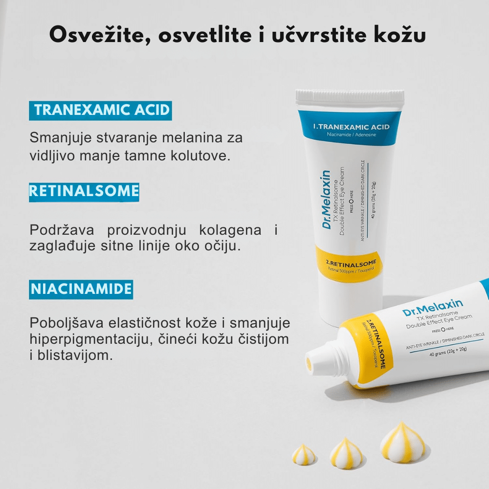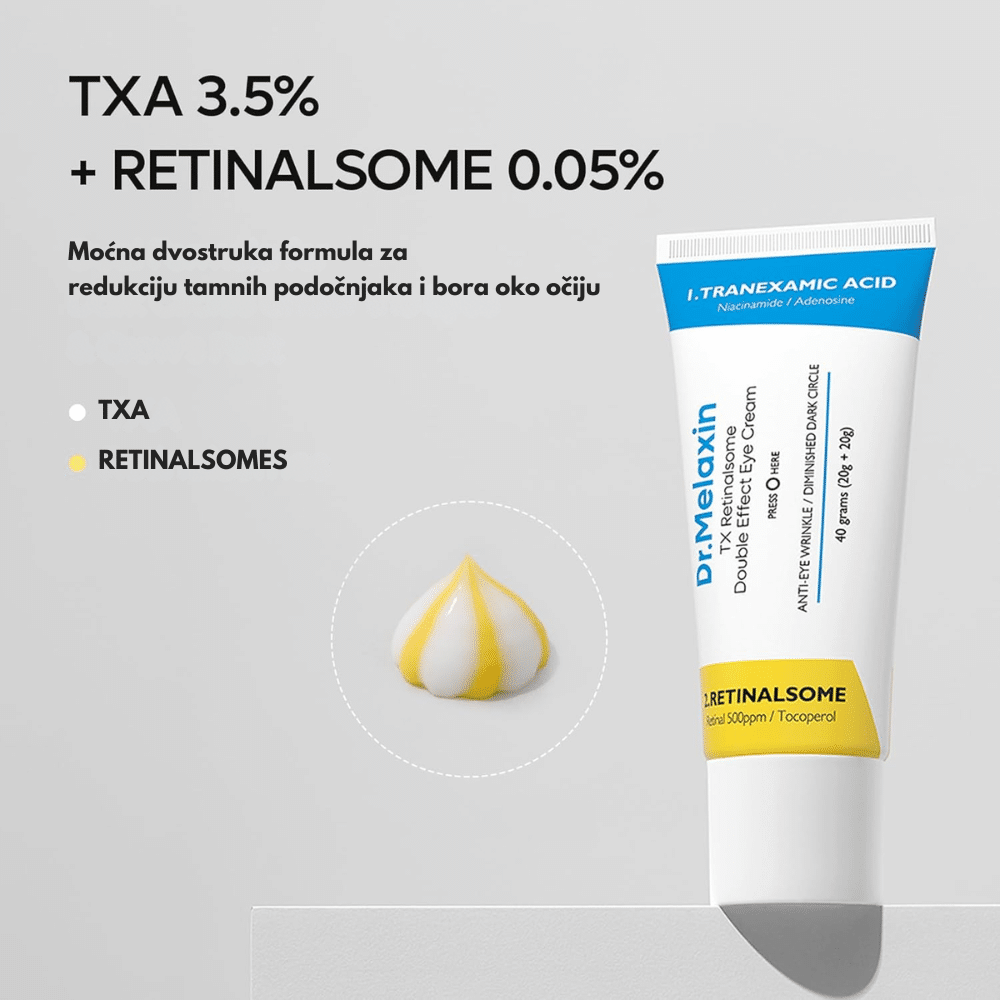 Dr.Melaxin TX Retinalsome Double Effect Eye Cream kombinuje anti-pigmentacione i anti-age tehnologije da posvetli okoloočnu zonu i smanji fine linije. Zahvaljujući formuli sa traneksaminskom kiselinom i retinalom, krema deluje na tamne kolutove, bore i gubitak elastičnosti, pružajući umirenje, hidrataciju i vidljivo ujednačen ten. Dva aktivna mehanizma (posvetljivanje i regeneracija) čine ovo efikasnim izborom za negu područja oko očiju — pogodno i za osetljivu kožu.