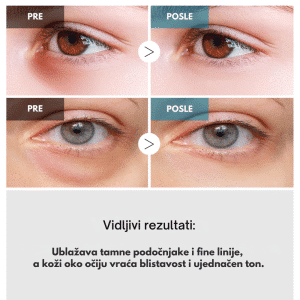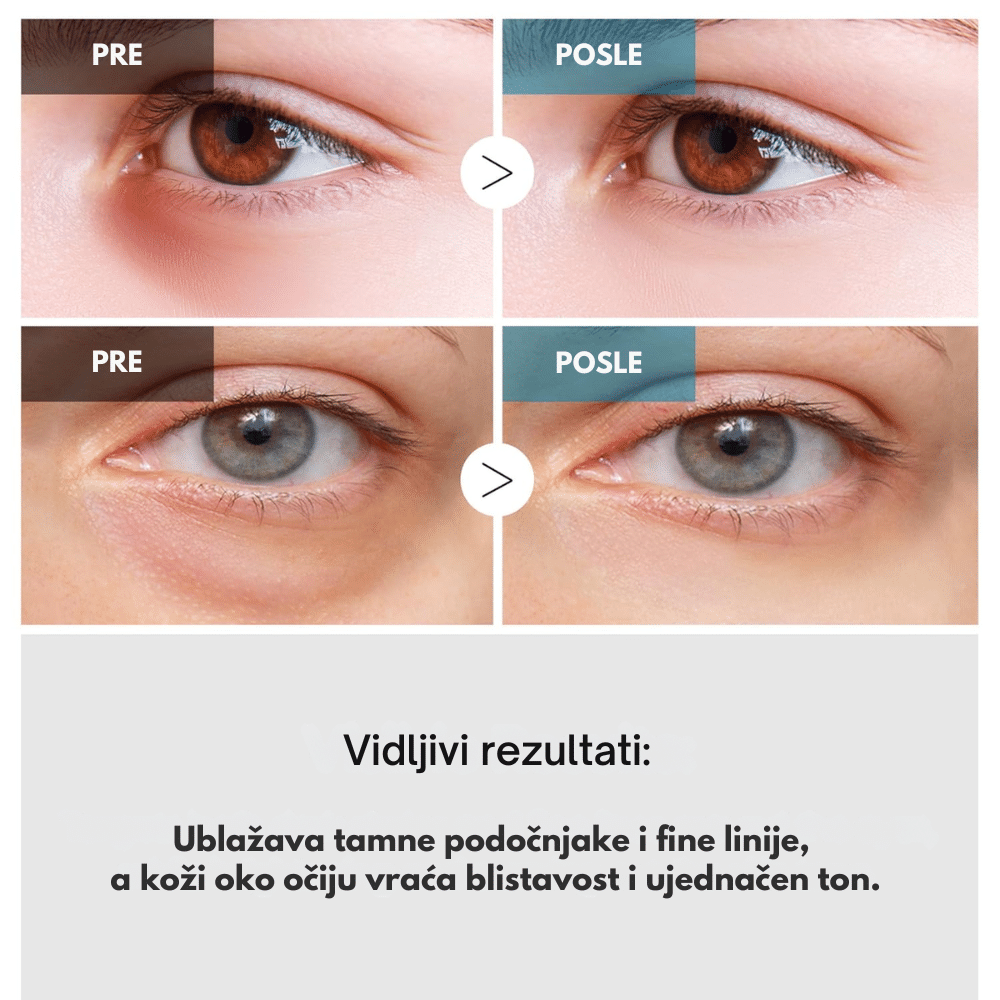 Dvostruka formula koja posvetljuje podočnjake, smanjuje fine linije i hidrira kožu oko očiju za ujednačen i blistav izgled.