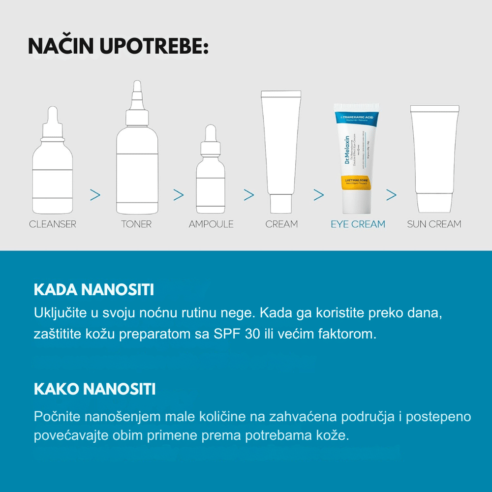 Nanesite malu količinu kreme nežnim tapkanjem oko područja očiju, izbegavajući direktan kontakt sa očima. Koristite ujutro i/ili uveče kao deo rutine nege. Ukoliko osećate iritaciju, prekinite upotrebu i isperite.
