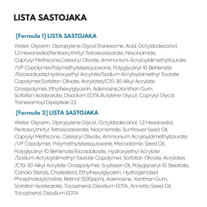 Water (Aqua), Glycerin, Dipropylene Glycol, Tranexamic Acid, Octyldodecanol, 1,2-Hexanediol, Pentaerythrityl Tetraisostearate, Niacinamide, Caprylyl Methicone, Cetearyl Olivate, Ammonium Acryloyldimethyl Taurate/VP Copolymer, Polymethylsilsesquioxane, Polyglyceryl-10 Behenate/Ecosadioate, Hydroxyethyl Acrylate/Sodium Acryloyldimethyl Taurate Copolymer, Sorbitan Olivate, Acrylates/C10-30 Alkyl Acrylate Crosspolymer, Ethylhexylglycerin, Adenosine, Xanthan Gum, Sorbitan Isostearate, Disodium EDTA, Butylene Glycol, Capryl Glycol, Helianthus Annuus (Sunflower) Seed Oil, Macadamia Ternifolia Seed Oil, Glycine Soja (Soybean) Oil, Rapeseed Sterol, Cholesterol, Hydrogenated Phosphatidylcholine, Retin-A (Retinal, 500 ppm), Tocopherol, Anato Seed Oil.