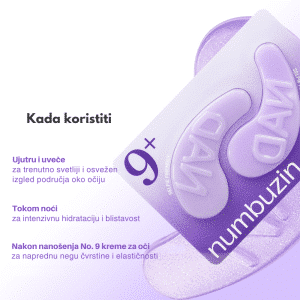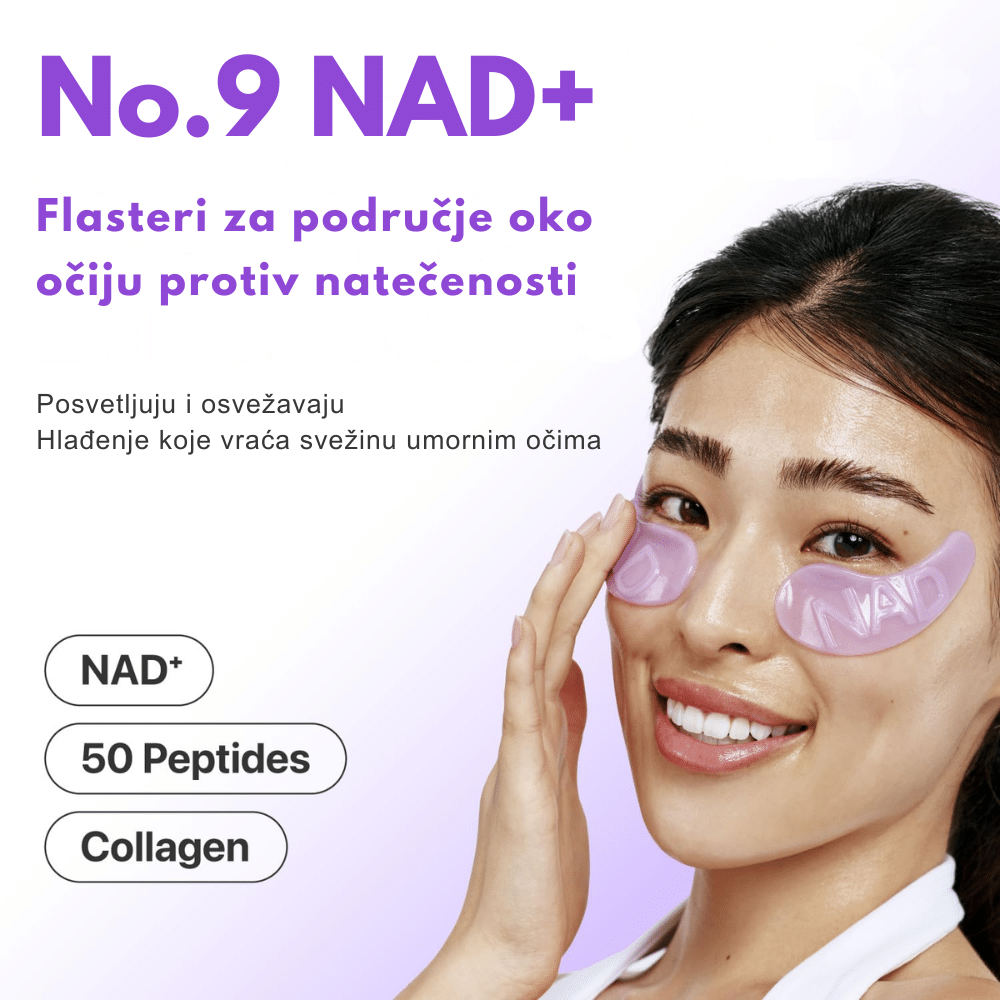Numbuzin No.9 NAD+ Collagen Under Eye Patches su hidrogel flasteri za područje ispod očiju koji pružaju intenzivnu negu i osveženje. Pomažu u poboljšanju izgleda umorne kože, doprinose hidrataciji i elastičnosti osetljive regije oko očiju.