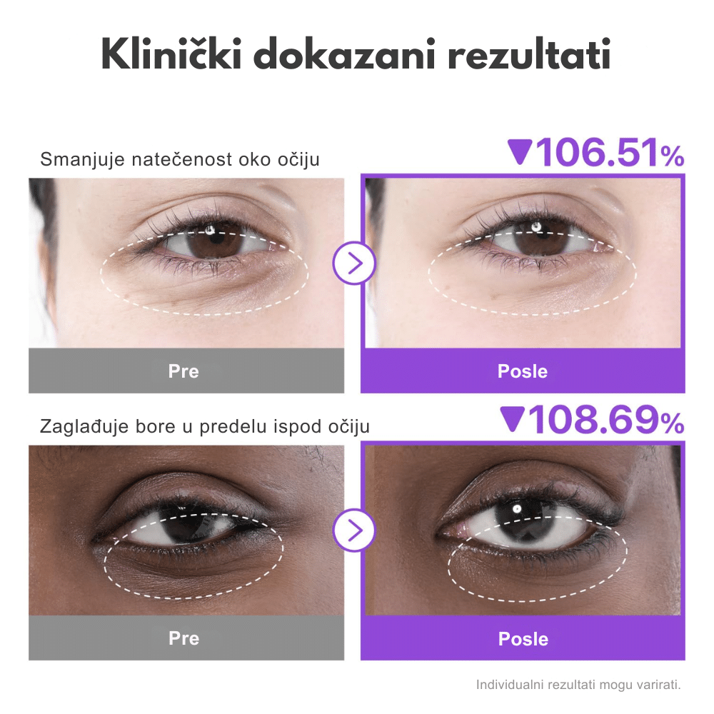 Očistiti kožu i naneti flastere ispod očiju. Ostaviti da deluju 15–20 minuta, zatim ukloniti i lagano utapkati ostatak seruma.