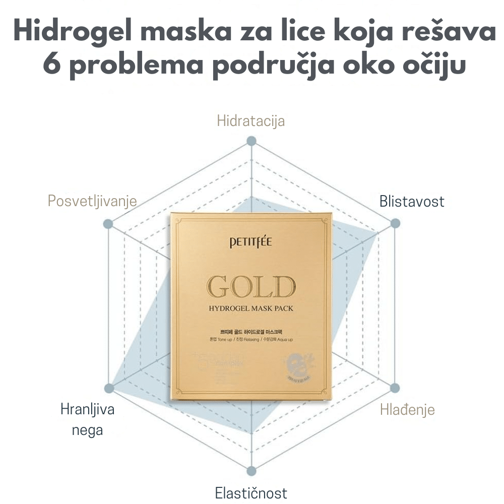 Zlatna hidrogel kombinacija za intenzivnu hidrataciju, osveženje i revitalizaciju kože lica i područja ispod očiju uz vidljiv sjaj.