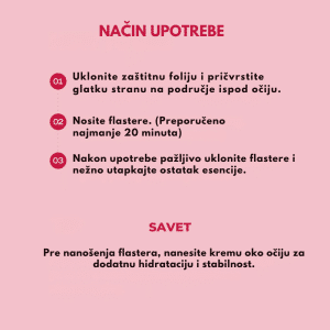 Nakon čišćenja kože i korišćenja tonera, postaviti po jedan flaster ispod svakog oka. Ostaviti da deluju 15–20 minuta. Skinuti flastere i preostali serum nežno utapkati vrhovima prstiju. Ne ispirati. Koristiti 3–4 puta nedeljno ili po potrebi.