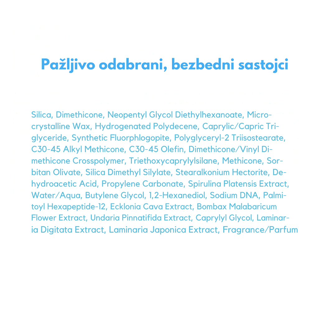 Silica, Dimethicone, Neopentyl Glycol Diethylhexanoate, Microcrystalline Wax, Hydrogenated Polydecene, Caprylic/Capric Triglyceride, Synthetic Fluorphlogopite, Polyglyceryl-2 Triisostearate, C30-45 Alkyl Methicone, C30-45 Olefin, Dimethicone/Vinyl Dimethicone Crosspolymer, Triethoxycaprylylsilane, Methicone, Sorbitan Olivate, Silica Dimethyl Silylate, Fragrance/Parfum, Stearalkonium Hectorite, Dehydroacetic Acid, Propylene Carbonate, Water (Aqua), Butylene Glycol, 1,2-Hexanediol, Ecklonia Cava Extract, Bombax Malabaricum Flower Extract, Undaria Pinnatifida Extract, Spirulina Platensis (Extract), Caprylyl Glycol, Laminaria Digitata Extract, Laminaria Japonica Extract, Sodium DNA (PDRN), Palmitoyl Hexapeptide-12.