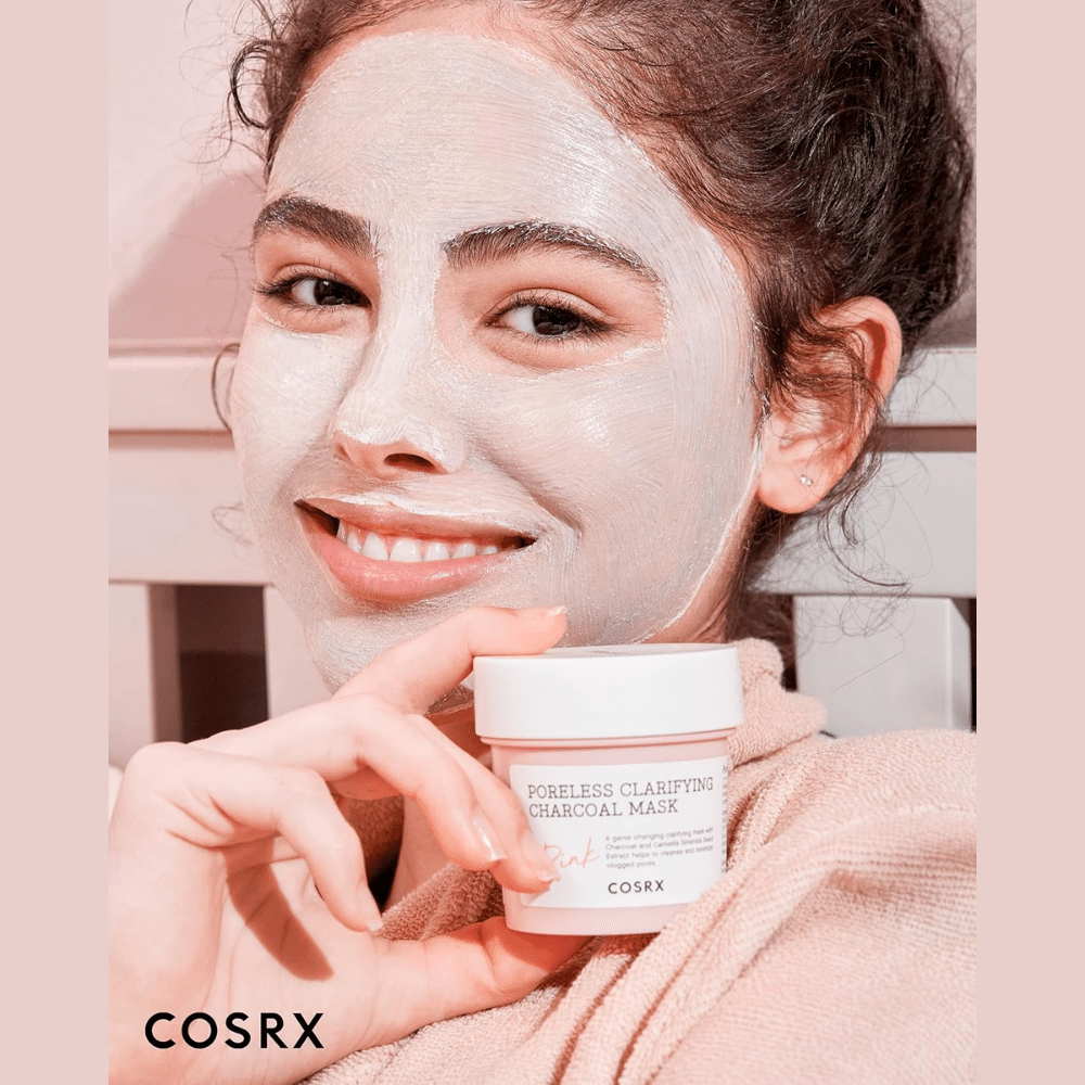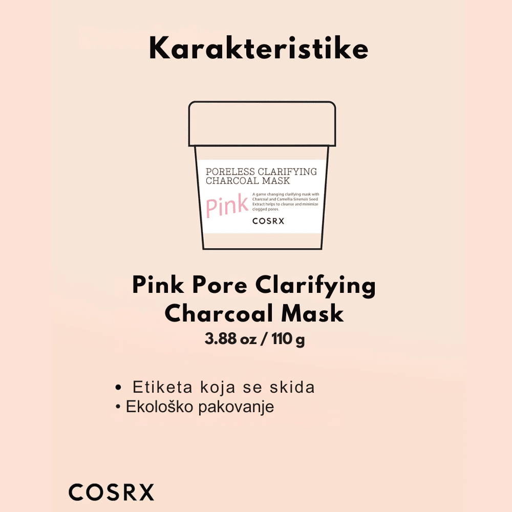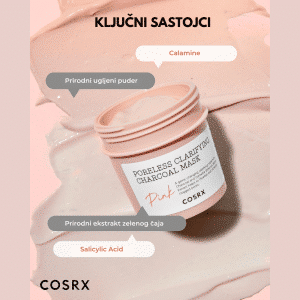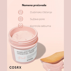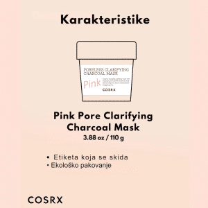 COSRX Poreless Clarifying Charcoal Mask Pink je maska za lice tipa wash-off, sa promenljivom bojom (počinje roze, prelazi u sivu, završava belom) koja efektivno dubinski čisti pore zahvaljujući aktivnom uglju, kaolinu, salicilnoj kiselini i kalamin kapsulama — pruža „spa u kući“ efekat za glatku, detoksifikovanu i uravnoteženu kožu.