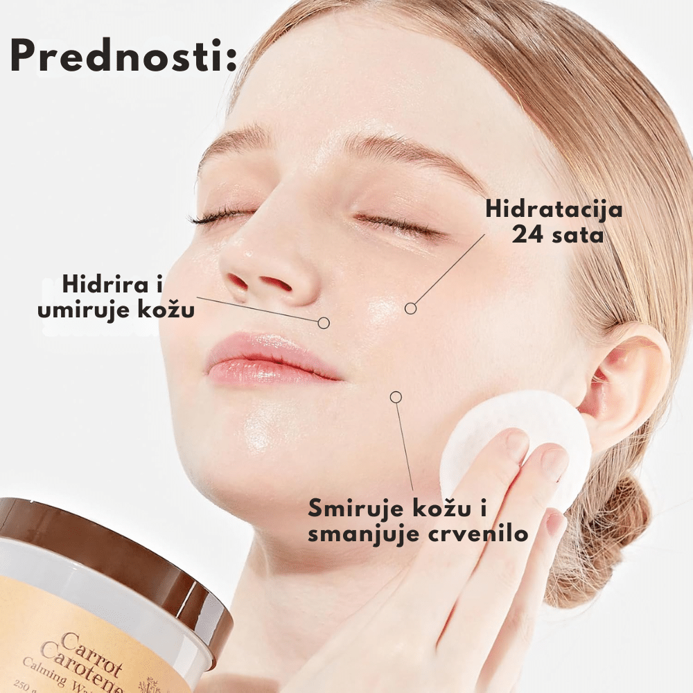 SKINFOOD Carrot Carotene Calming Water Pad je umirujući tretman u obliku pamučnih jastučića natopljenih hidratantnim i antioksidativnim rastvorom. Glavni sastojak, beta-karoten iz šargarepe, bogat je antioksidansima koji štite kožu od oštećenja slobodnih radikala, dok umiruje iritacije i crvenilo. Ovi jastučići sadrže i hijaluronsku kiselinu za hidrataciju kao i alantoin, koji dodatno umiruje i osvežava kožu.