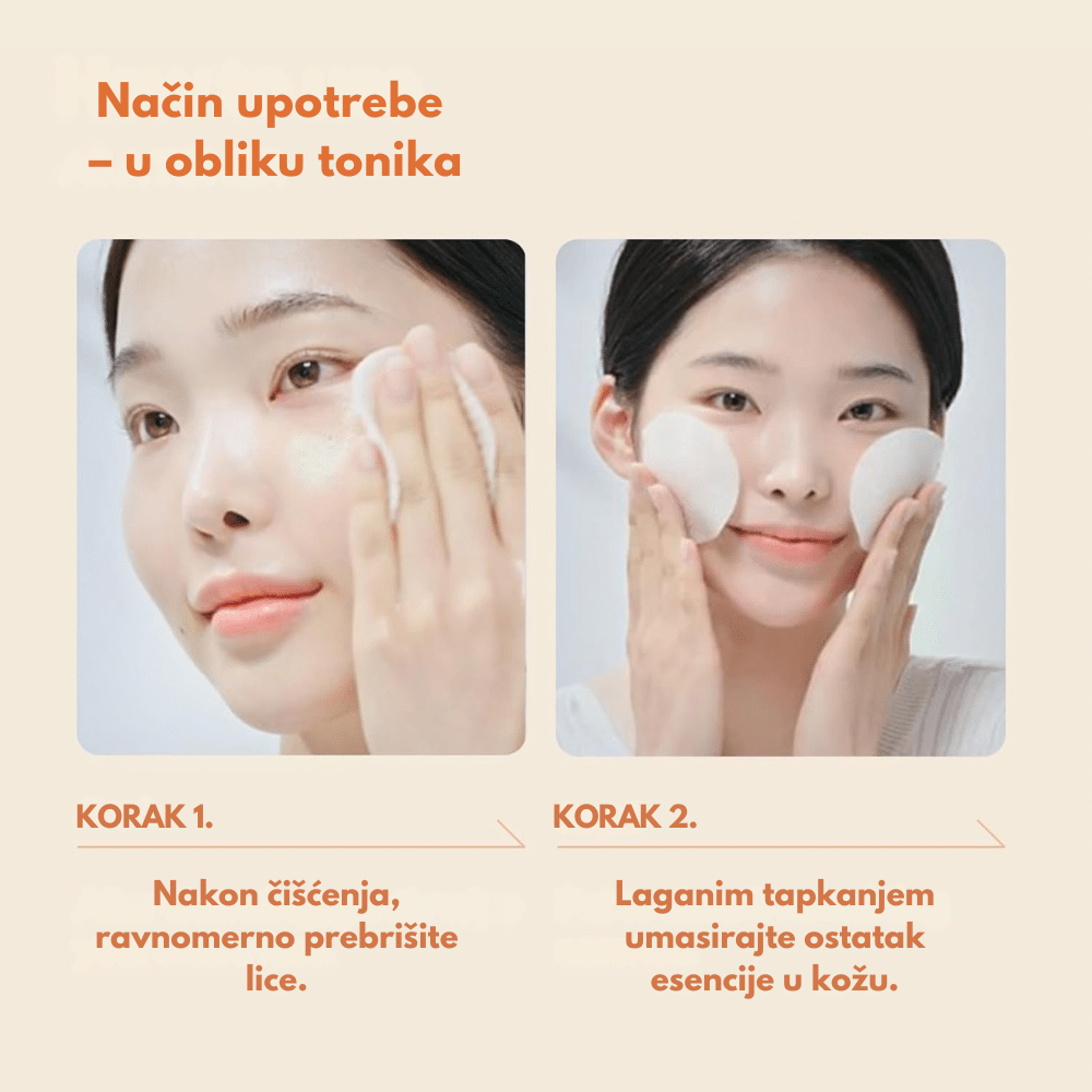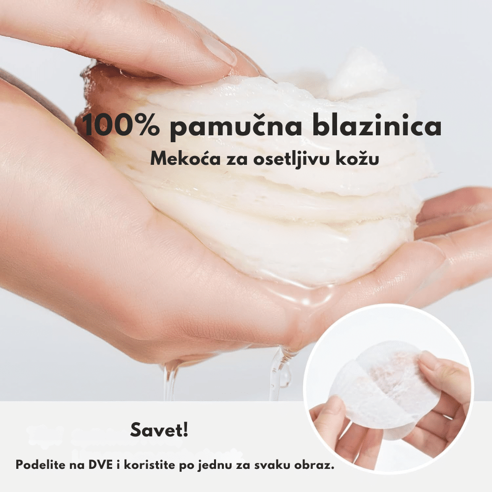 Nakon čišćenja lica, uzmite jedan pamučni jastučić i nežno prebrišite lice, izbegavajući područje oko očiju i usana. Jastučiće možete koristiti i kao masku – jednostavno stavite ih na ciljane zone (obraze, čelo ili bradu) i ostavite da deluju 5-10 minuta za intenzivnu hidrataciju i umirenje. Nakon upotrebe, nastavite sa ostatkom rutine nege kože.
