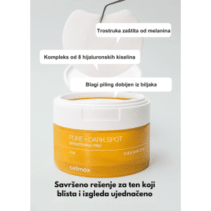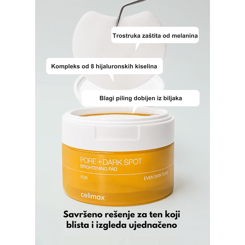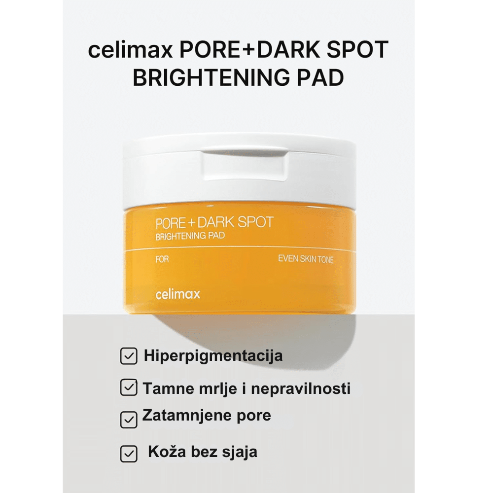 Celimax Pore+ Dark Spot Brightening Pad su multifunkcionalni tonik jastučići namenjeni ujednačavanju tena, smanjenju tamnih fleka i poboljšanju izgleda pora. Natopljeni su esencijom koja pomaže u osvežavanju kože, zaglađivanju teksture i postizanju svetlijeg, čistijeg tena. Idealni su za brzu i praktičnu svakodnevnu negu kože.
