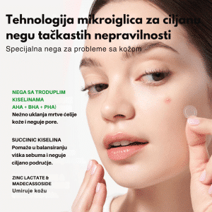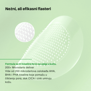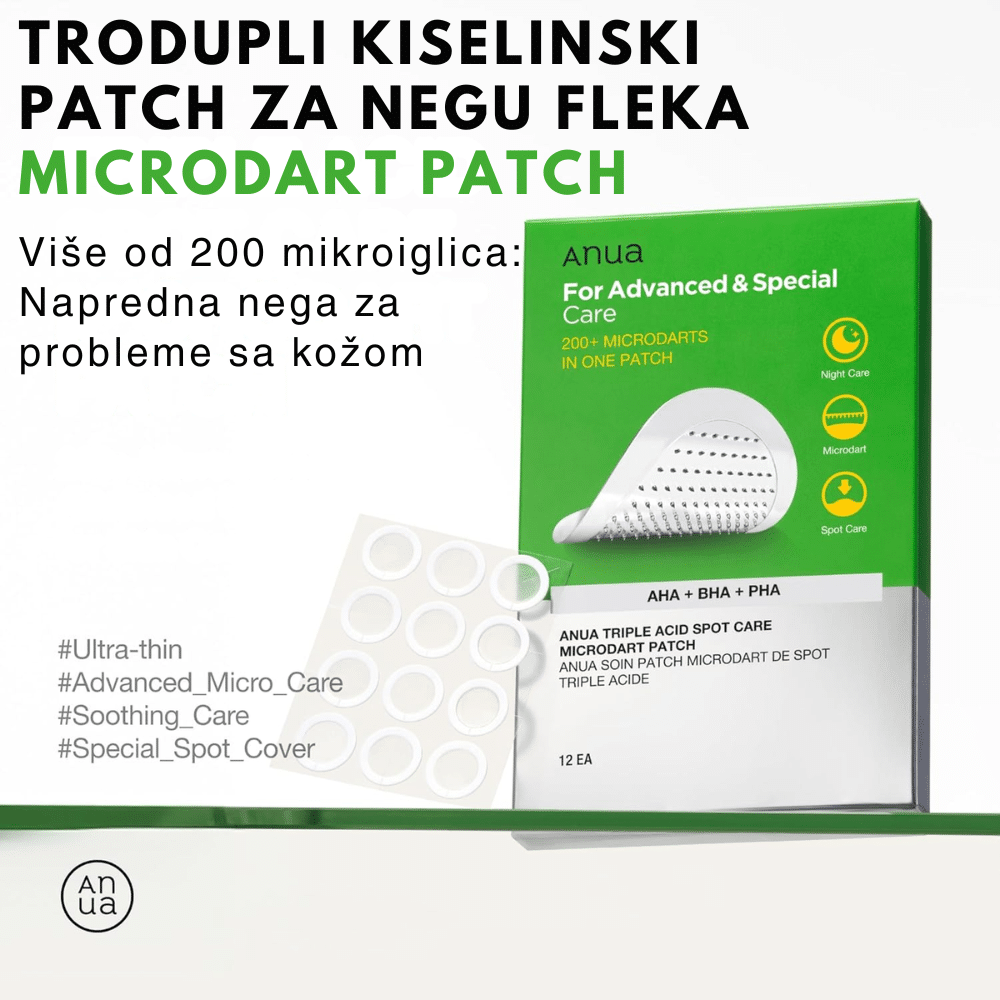 Anua Triple Acid Spot Care Microdart Patch je ultra-tanki hydrocolloid flaster sa više od 200 mikrodart vrhova koji istovremeno pokrivaju i tretiraju problematična područja. Sadrži trostruki kiseli kompleks (AHA, BHA, PHA), ekstrakt centelle, succinic acid i madecassoside koji nežno uklanjaju mrtve ćelije, balansiraju višak sebuma i umiruju iritiranu kožu, rezultujući vidljivo smanjenim aknama i pročišćenim porama. Dizajniran je za noćnu upotrebu – tanak 0,3 mm odgovara obliku kože, ostaje na mestu i omogućava efikasnu apsorpciju. Dermatološki testiran, nekomedogen, sa minimalnom iritacijom – pogodan i za osetljivu kožu