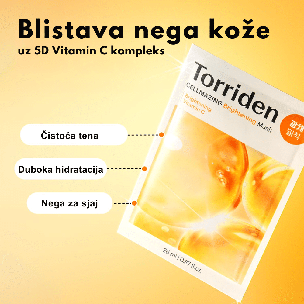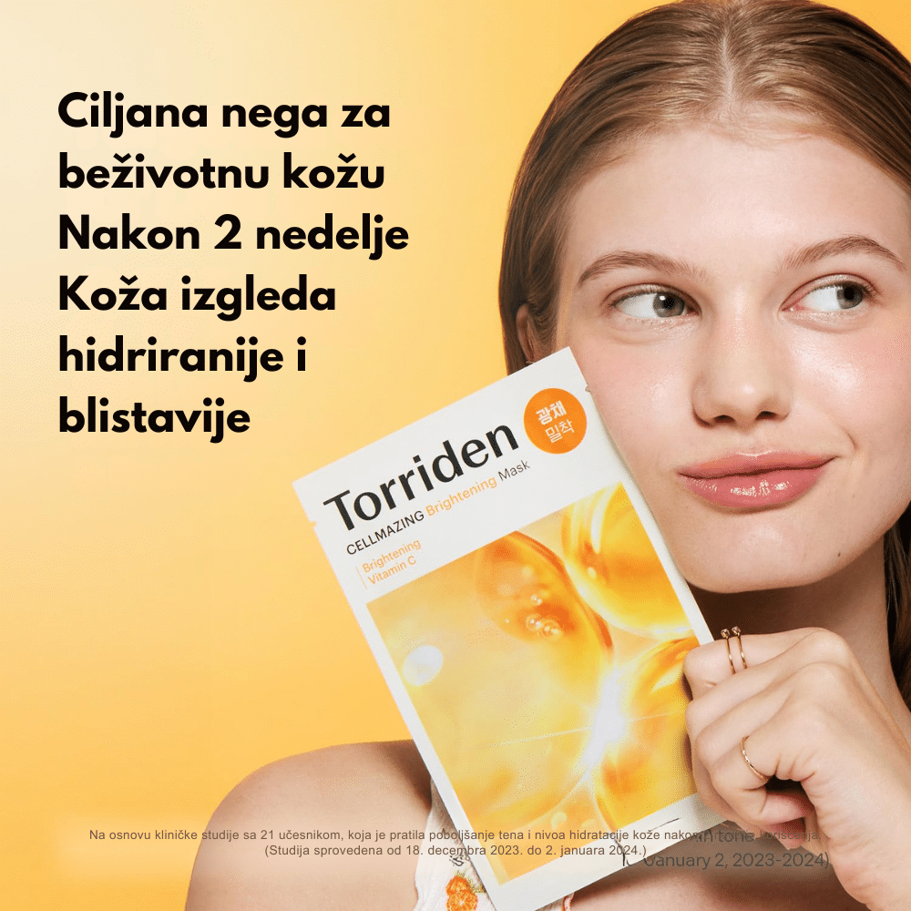 Torriden Cellmazing Brightening Mask je sheet maska bogata kompleksom „5D liposome vitamina C”, niacinamidom i hijaluronskim kiselinama, osmišljena da posvetli ten, ujednači pigmentaciju i dubinski hidrira kožu.