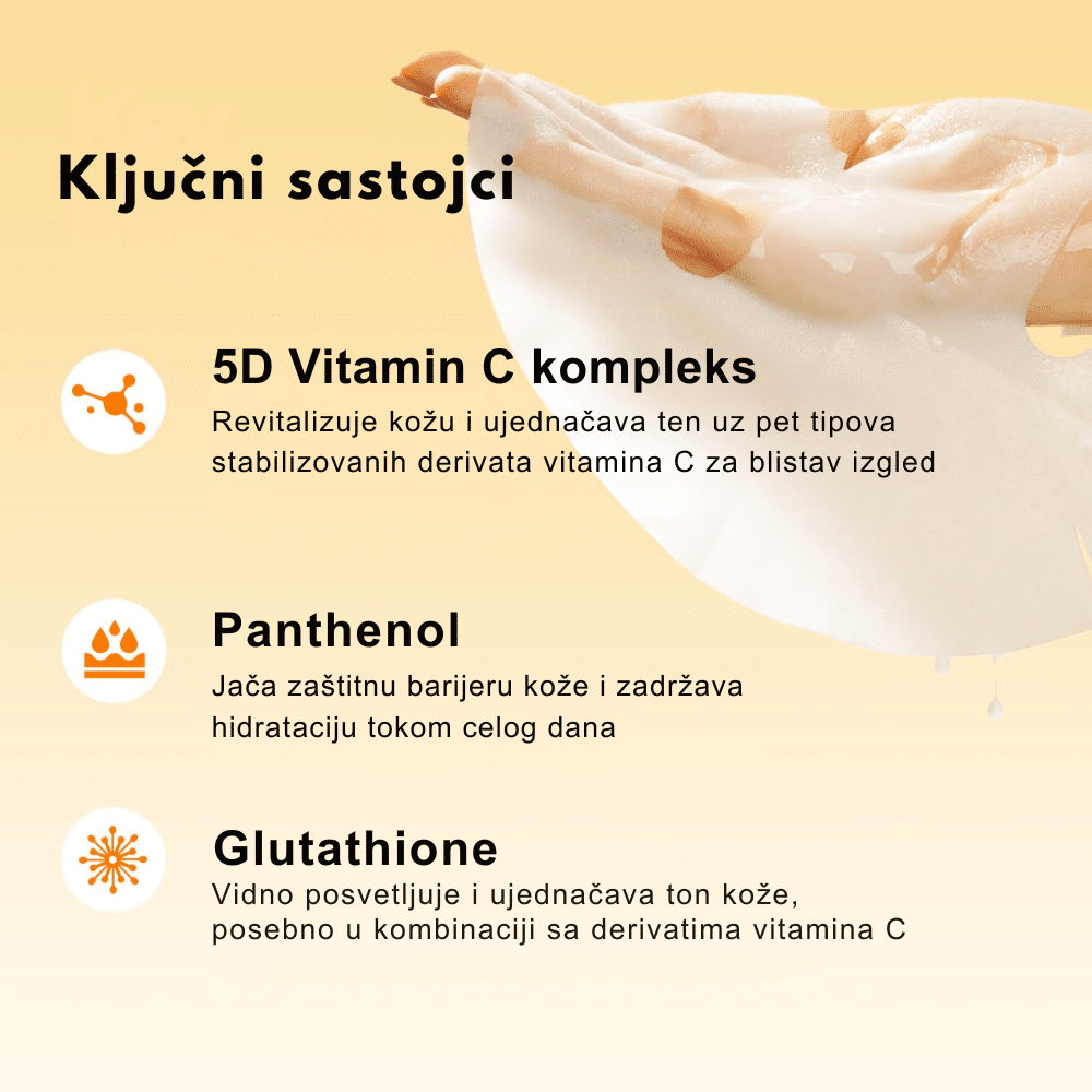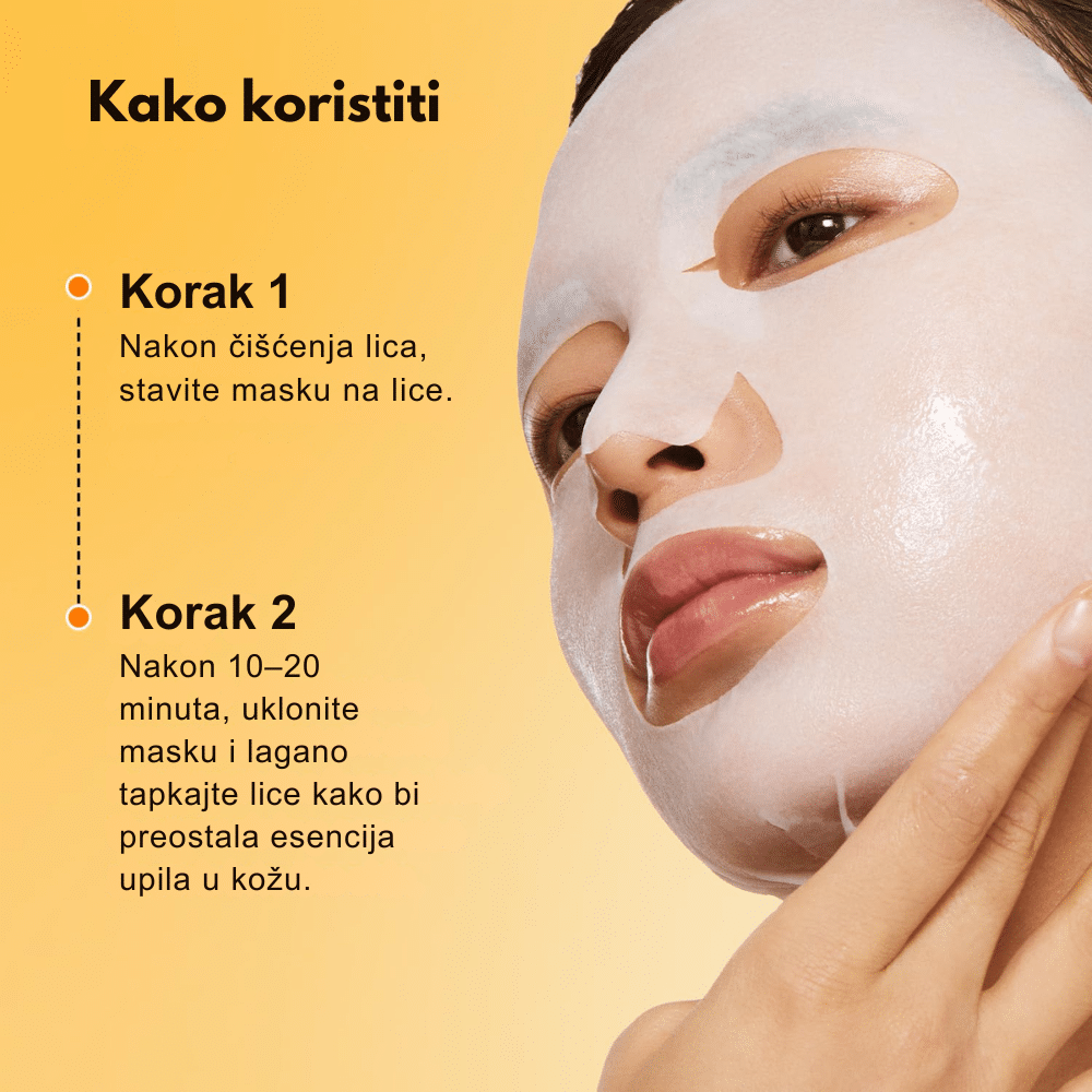 Sheet maska koja intenzivno hidrira, posvetljuje ten i smanjuje vidljivost fleka, ostavljajući kožu svežom i blistavom.