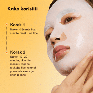 Nakon čišćenja i toniranja kože nanesite masku na lice i vrat, ostavite 15–20 minuta, potom uklonite masku i nežno utapkajte preostalu esenciju dok se potpuno ne upije. U slučaju iritacije prekinite upotrebu.