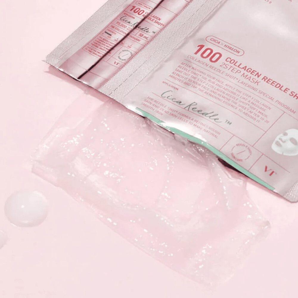 VT Collagen Reedle Shot 100 2Step Mask je dvostepena tretman maska koja kombinuje mikropikularnu Reedle tehnologiju sa kolagenom kako bi se aktivni sastojci efikasnije apsorbovali i pružili vidljivo zaglađivanje i učvršćivanje kože. Prvi korak priprema kožu i poboljšava njenu sposobnost upijanja, dok drugi korak intenzivno hidrira, poboljšava elastičnost i doprinosi punijem i svežijem izgledu tena. Namenjena je koži kojoj je potrebna brza regeneracija i boost elastičnosti.