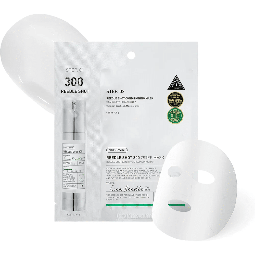 VT Cosmetics Mild Reedle Shot 300 2-Step Mask je inovativna maska koja kombinuje prednosti mikro-iglica i intenzivne hidratacije za poboljšanje teksture kože i smanjenje finih linija. Ova maska se sastoji od dva koraka: