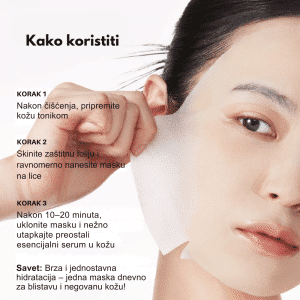 Masku koristite 1–2 puta nedeljno: očistite lice, nanesite masku i ostavite 10–20 minuta, potom uklonite i tapkajte višak esencije u kožu. Idealno kao završni korak nege — ujutru i uveče. Ako primetite iritaciju, prekinite upotrebu.