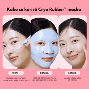 Nakon čišćenja lica, nanesite jednu od Cryo Rubber maski na celo lice i ostavite da deluje 20–30 minuta. Nakon uklanjanja, lagano utapkajte preostali proizvod dok se potpuno ne upije. Maske se mogu koristiti pojedinačno ili naizmenično, u zavisnosti od potreba kože. Preporučuje se upotreba jednom nedeljno ili češće za intenzivno umirenje, hidrataciju i zatezanje kože.