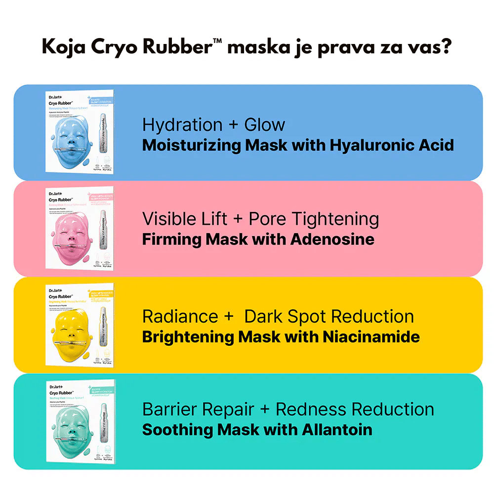 Ova pažljivo osmišljena kombinacija Cryo Rubber maski namenjena je koži kojoj su potrebni umirenje, hidratacija i poboljšanje čvrstine. Zahvaljujući Cryo Rubber tehnologiji, maske pružaju trenutni hladni efekat koji pomaže u smanjenju otečenosti i poboljšava apsorpciju aktivnih sastojaka, dok kožu intenzivno osvežava i revitalizuje.