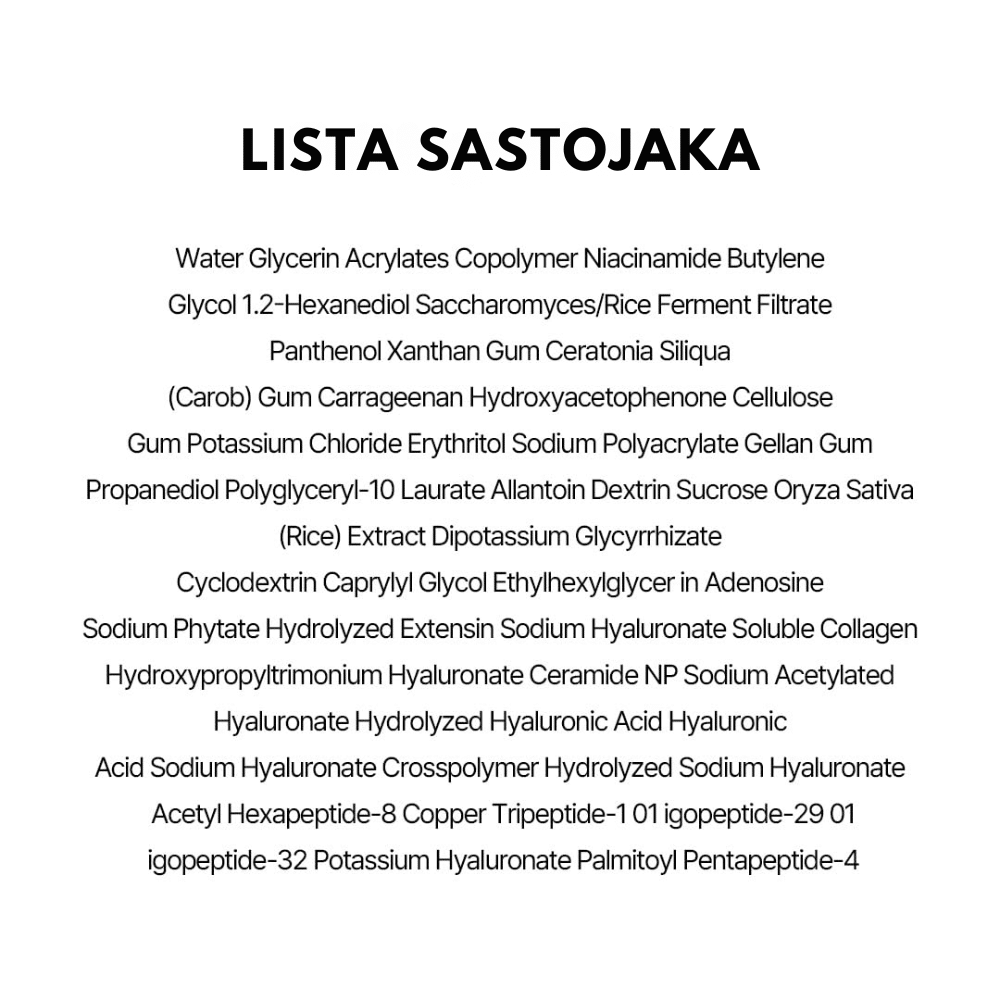 Water, Glycerin, Oryza Sativa (Rice) Extract, Hydrolyzed Collagen, Butylene Glycol, 1,2-Hexanediol, Acetyl Hexapeptide-8, Palmitoyl Tripeptide-1, Sodium Hyaluronate, Panthenol, Allantoin, Betaine, Tocopherol, Hydroxyethylcellulose, Carbomer, Arginine, Disodium EDTA.