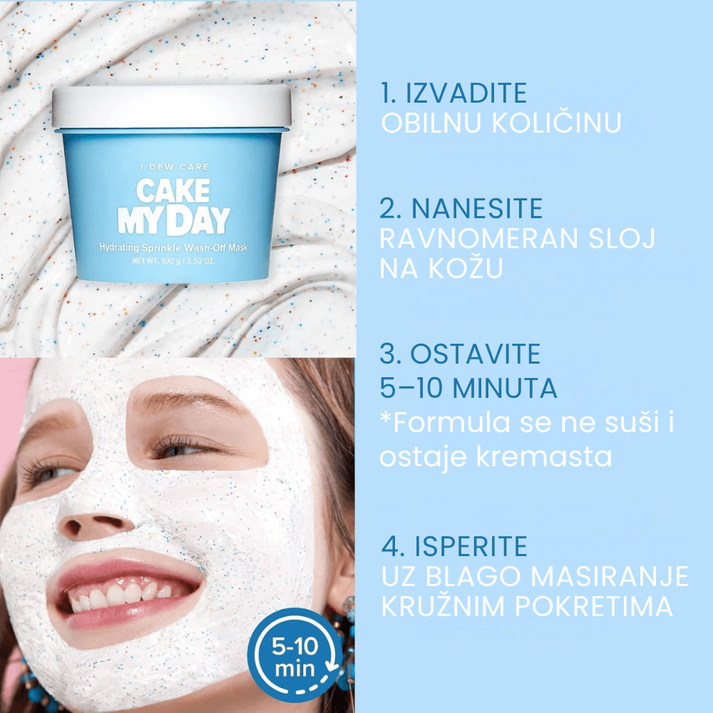 Nanesite ravnomeran sloj I DEW CARE Cake My Day maske na čistu, suvu kožu, izbegavajući područje oko očiju i usana. Ostavite da deluje 5-10 minuta, zatim isperite mlakom vodom. Koristite 2-3 puta nedeljno za optimalne rezultate. U slučaju iritacije, prekinite upotrebu i konsultujte se sa dermatologom.