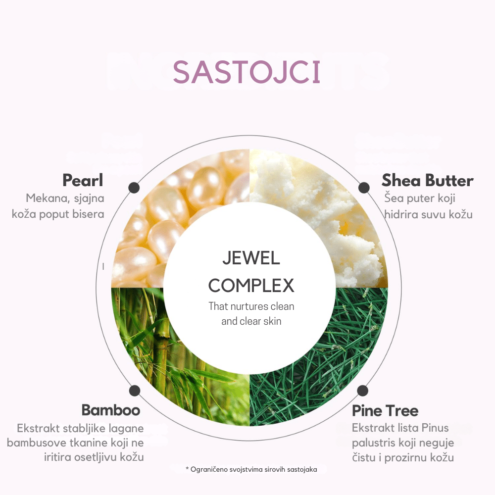 Water, Glycerin, Calcium Chloride, Butylene Glycol, Ceratonia Siliqua (Carob) Gum, Xanthan Gum, Butyrospermum Parkii (Shea) Butter (1%), Hydroxyethylcellulose, PEG‑60 Hydrogenated Castor Oil, Ethanol, Pearl Powder (0.05%), Disodium EDTA, Triethanolamine, Scutellaria Baicalensis Root Extract, Camellia Sinensis Leaf Extract, Houttuynia Cordata Extract, Artemisia Vulgaris Extract, Citrus Junos Fruit Extract, 1,2‑Hexanediol, Caprylyl Glycol, Chlorphenesin, Phenoxyethanol, Methylparaben, Fragrance
