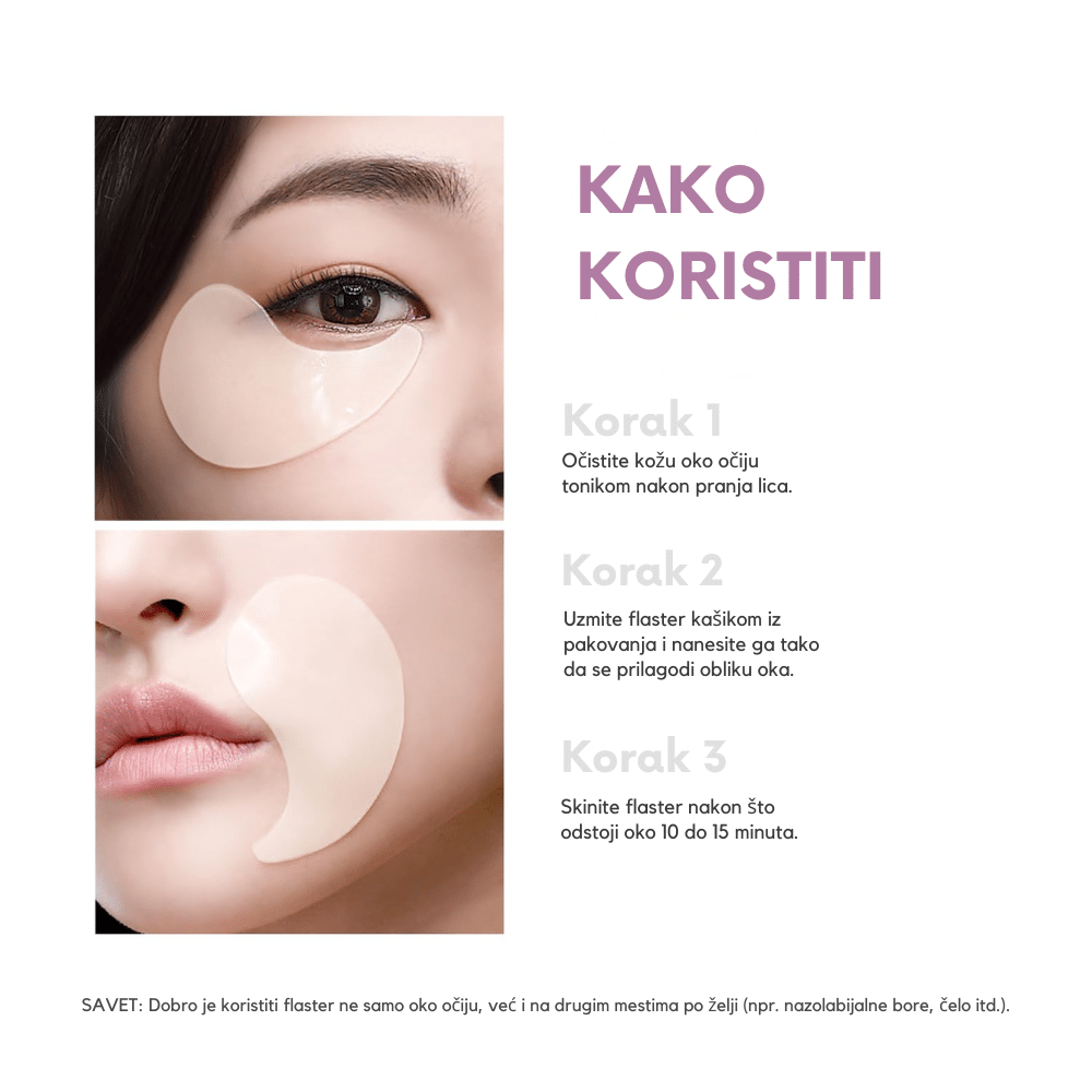 Nakon čišćenja i toniranja, pažljivo postavite patch ispod očiju na čistu i suvu kožu, ostavite da deluje 10–15 minuta. Skinite patch i nežno tapkajte ostatak esencije u kožu. Može se koristiti svakodnevno ujutro i/ili uveče. Čuvanje u frižideru pojačava efekat hlađenja. Ako dođe do iritacije, preporučuje se smanjenje učestalosti upotrebe.