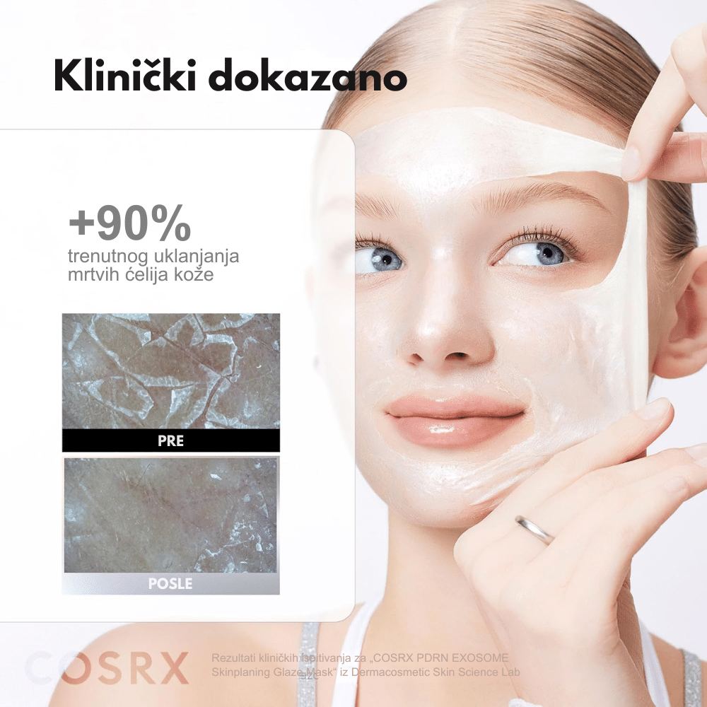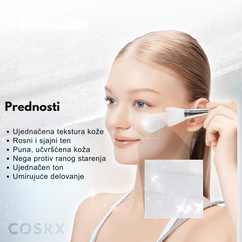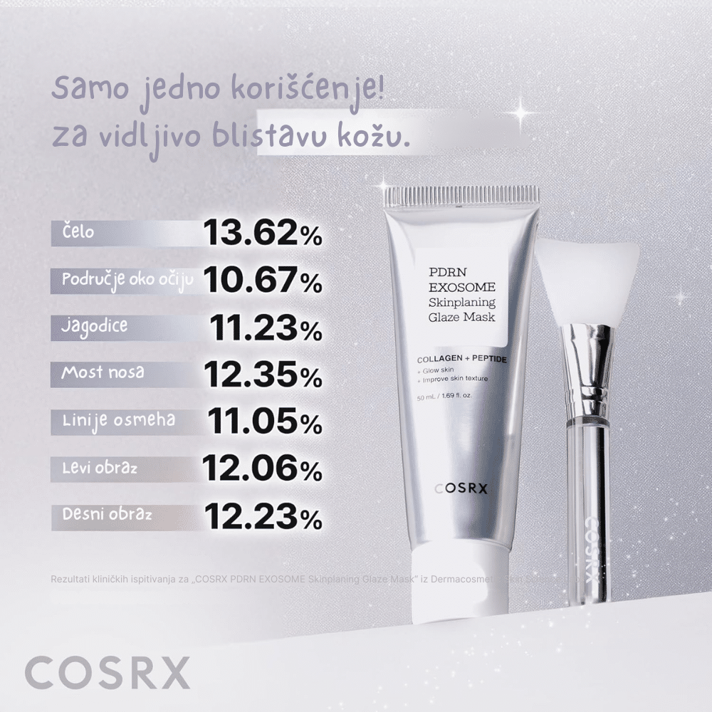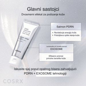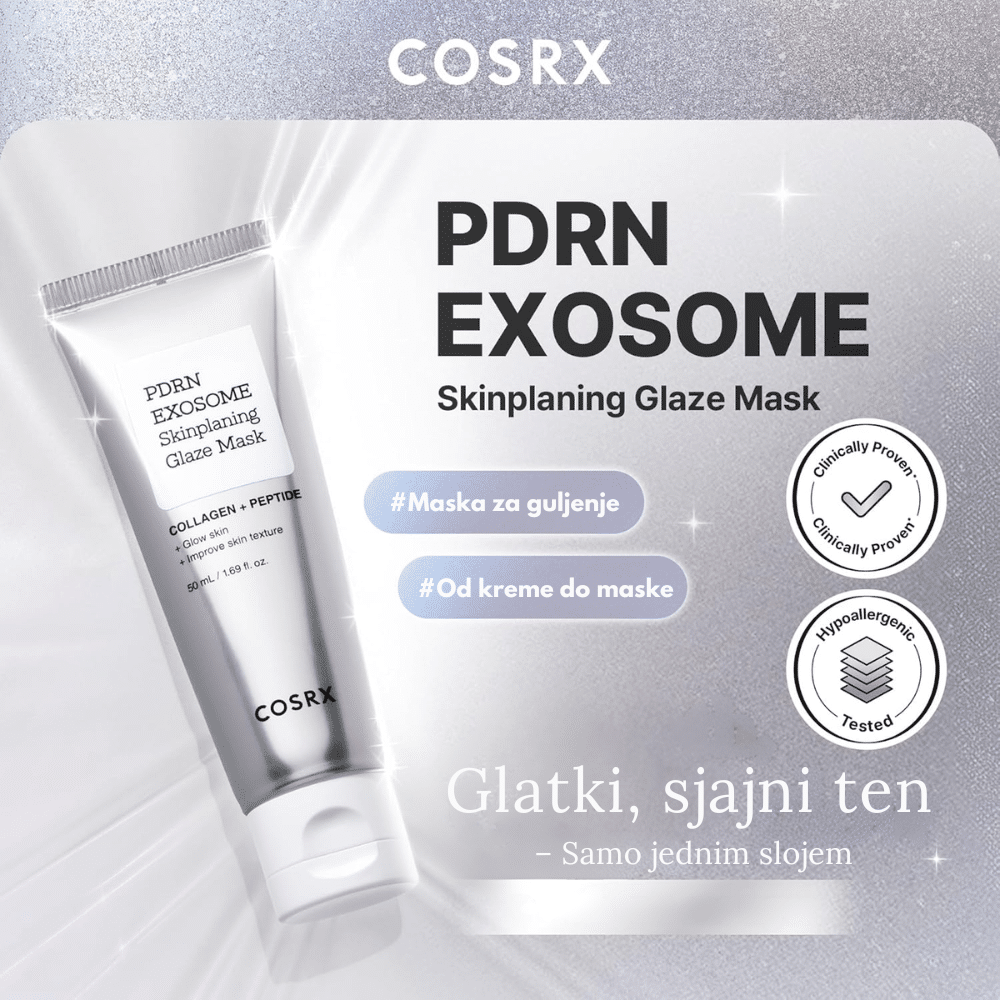 Cosrx PDRN Exosome Skinplaning Glaze Mask predstavlja revolucionarni tretman koji simulira profesionalni efekat “skinplaninga” (uklanjanja mrtvih ćelija i finih dlačica) bez mehaničke iritacije, ostavljajući kožu savršeno glatkom i blistavom. Ova inovativna maska koristi snagu biljnog PDRN-a i eksozoma kako bi dubinski regenerisala tkivo, dok njena jedinstvena “glaze” tekstura stvara zaštitni sloj koji intenzivno hidrira i “zaključava” aktivne sastojke u dermis. Formulacija je obogaćena AHA i PHA kiselinama nove generacije koje nežno uklanjaju akumulirane nečistoće i izravnavaju teksturu kože, dajući joj onaj prepoznatljivi korejski “glass skin” finiš. Idealna je za postizanje besprekornog tena pre nanošenja šminke ili kao nedeljni tretman za revitalizaciju beživotne kože kojoj je potrebna hitna obnova i sjaj. Uz redovnu upotrebu, pore postaju vidno sužene, a ton kože ujednačen i prosvetljen.
