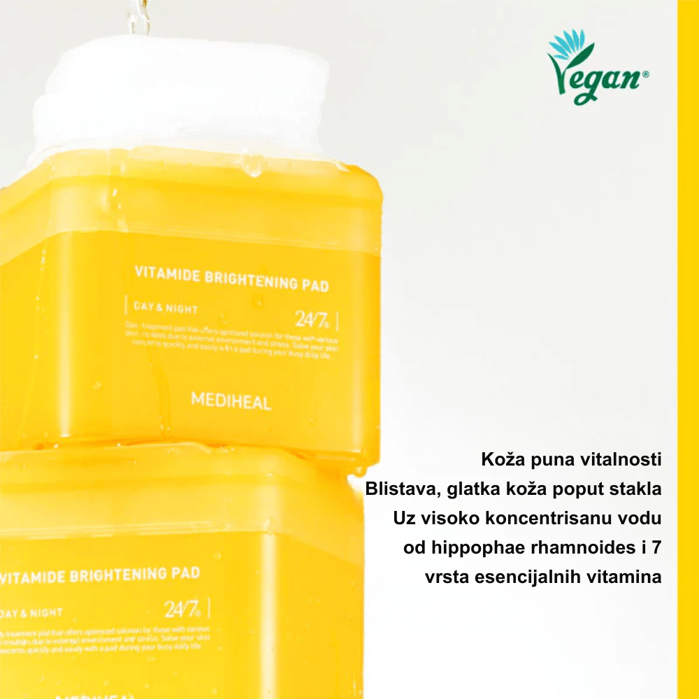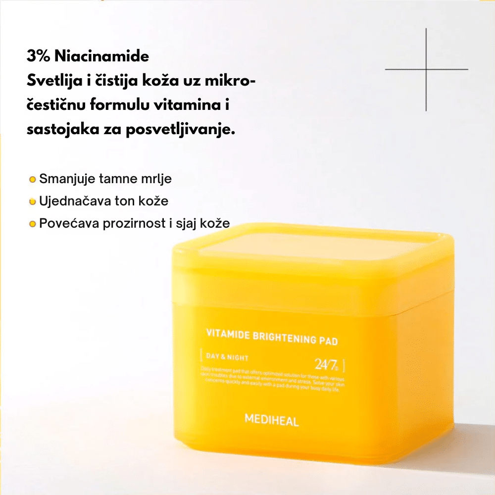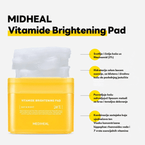 Mediheal Vitamide Brightening Pad predstavlja visokoefikasan tretman za prosvetljivanje tena i uklanjanje hiperpigmentacija, dizajniran da koži vrati izgubljenu blistavost i ujednačen ton. Ovi jastučići su natopljeni bogatom esencijom koja sadrži visoku koncentraciju vitamina – uključujući derivate vitamina C, vitamin E i čak 3% niacinamida (vitamina B3). Ova moćna kombinacija deluje sinergijski na suzbijanje proizvodnje melanina, čime se vidno smanjuju tamne fleke, ožiljci od akni i sivi, umorni izgled lica. Zahvaljujući lipozomalnoj tehnologiji, vitamini su inkapsulirani kako bi zadržali maksimalnu stabilnost i prodrli duboko u kožu bez izazivanja iritacija. Jastučići su izrađeni od meke tkanine koja omogućava optimalno prijanjanje, bilo da ih koristiš za svakodnevni piling i toniranje ili kao intenzivnu “vitamin infuziju” u formi mini maske. Rezultat je vidno svetlija, čistija i vitalnija koža koja odiše prirodnim sjajem. Pakovanje od 100 komada sa priloženom pincetom osigurava higijensku i dugotrajnu upotrebu, čineći ih nezaobilaznim korakom za postizanje besprekornog i blistavog tena.