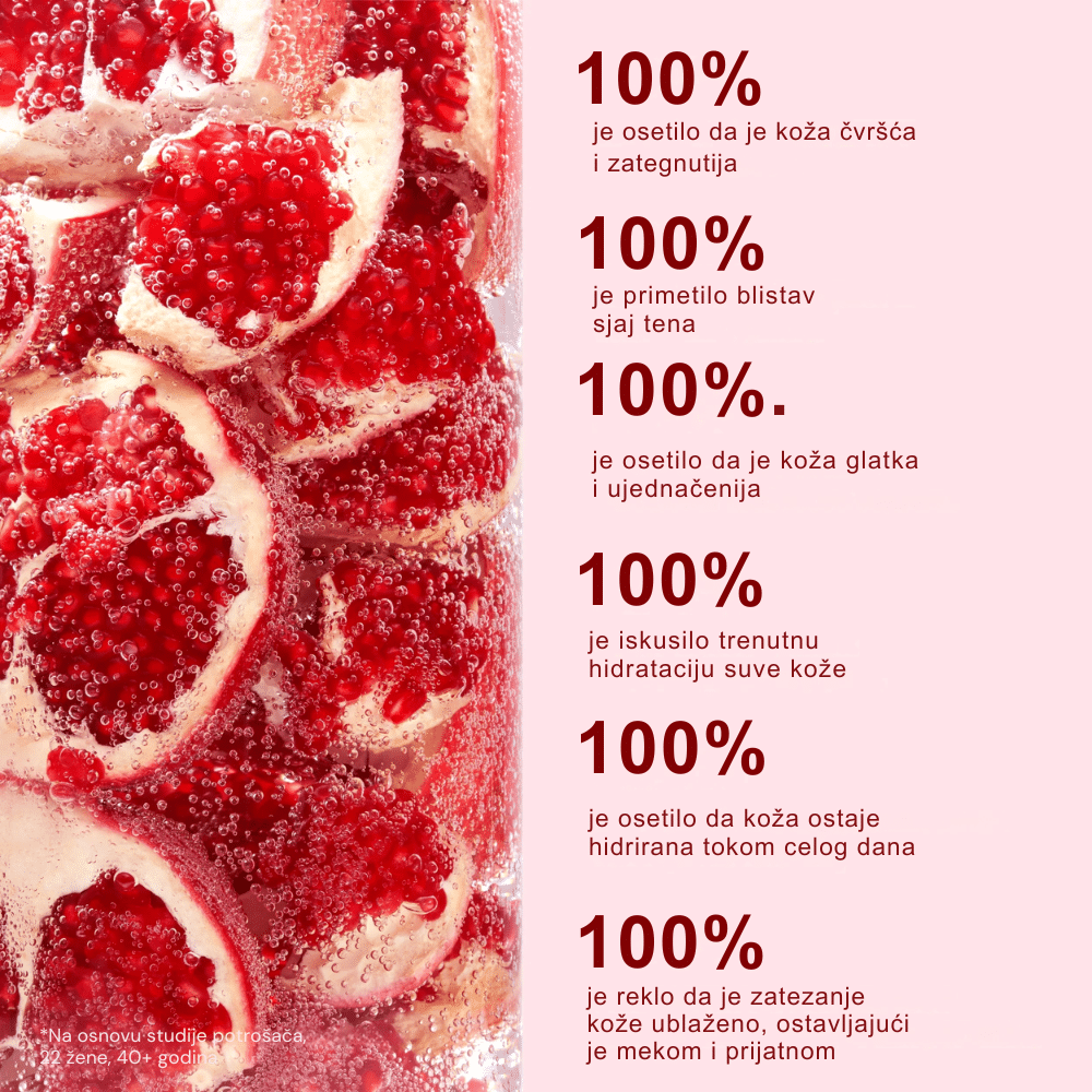 Efekat “liftinga” je trenutan i kumulativan – maska fizički zateže kožu dok se suši, ostavljajući za sobom neverovatan sjaj i glatku teksturu nakon uklanjanja. Pomegranate Collagen Glow and Lift Wrapping maska transformiše beživotnu i umornu kožu, popunjava sitne linije i pruža onaj željeni “glass skin” finiš koji traje satima. Formula je dizajnirana da ojača elastična vlakna kože, čineći je otpornijom na gravitaciju, dok istovremeno dubinski hrani i revitalizuje ten, pružajući vam profesionalni spa tretman u udobnosti sopstvenog doma.