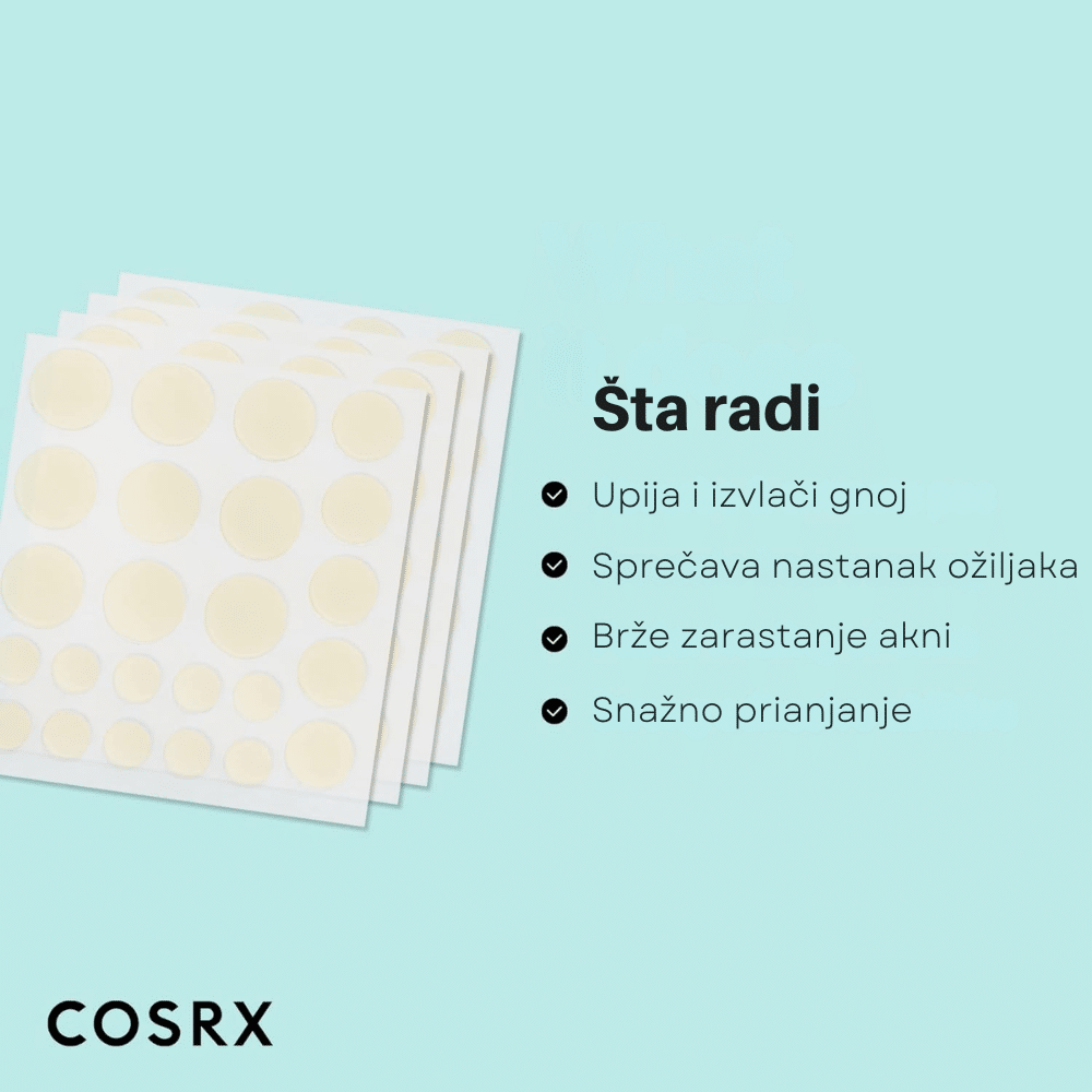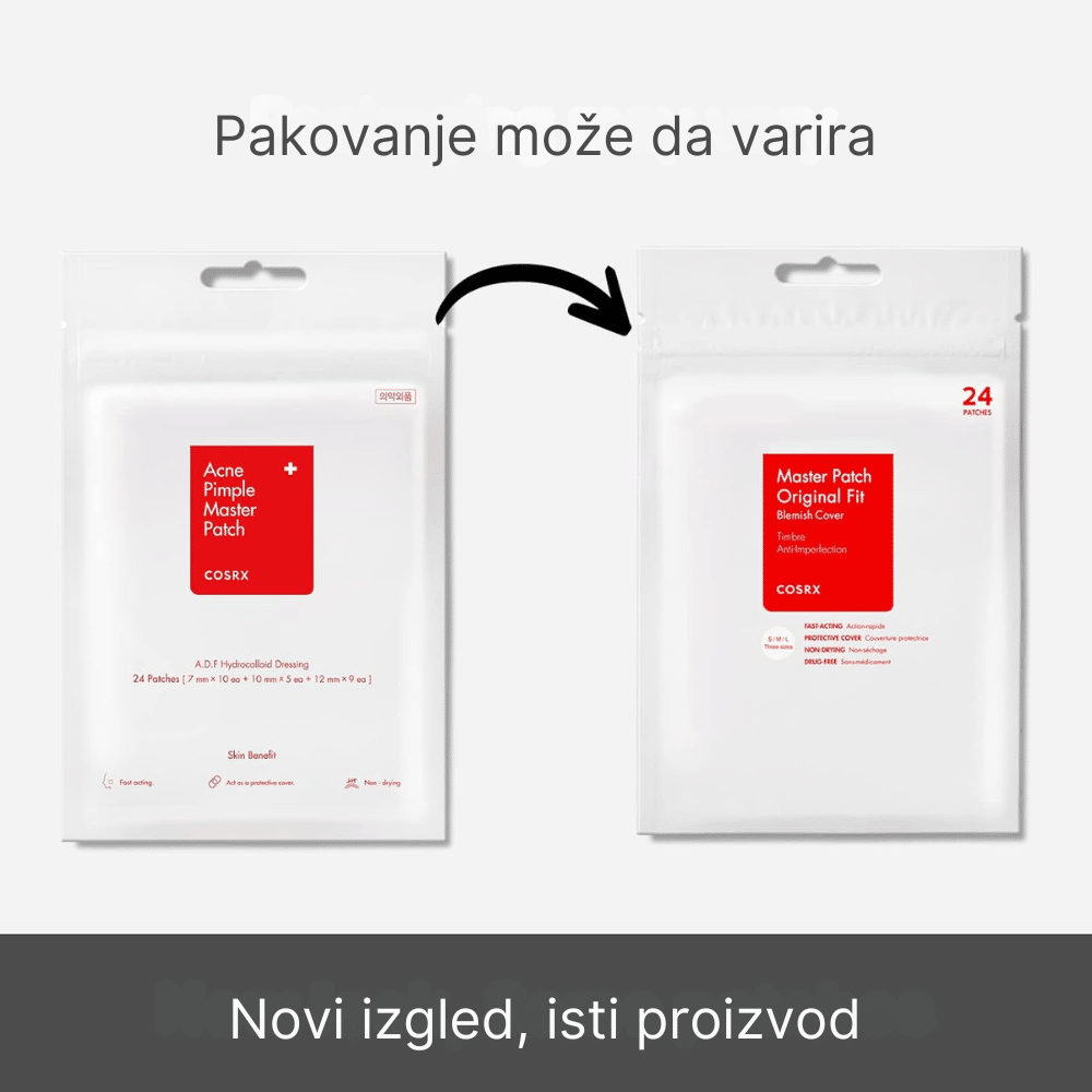 COSRX Acne Pimple Master Patch (Original Fit) predstavlja klasičan paket hidrokoloidnih flastera u tri dimenzije: male, srednje i velike tačkice. Dizajnirani su da brzo upiju tečnost i nečistoće iz upalnih procesa, smanje upalu i zaštite kožu od daljeg iritacije. Flasteri ostaju neprimetni na koži i pogodni su za nošenje tokom dana ili pod šminkom.