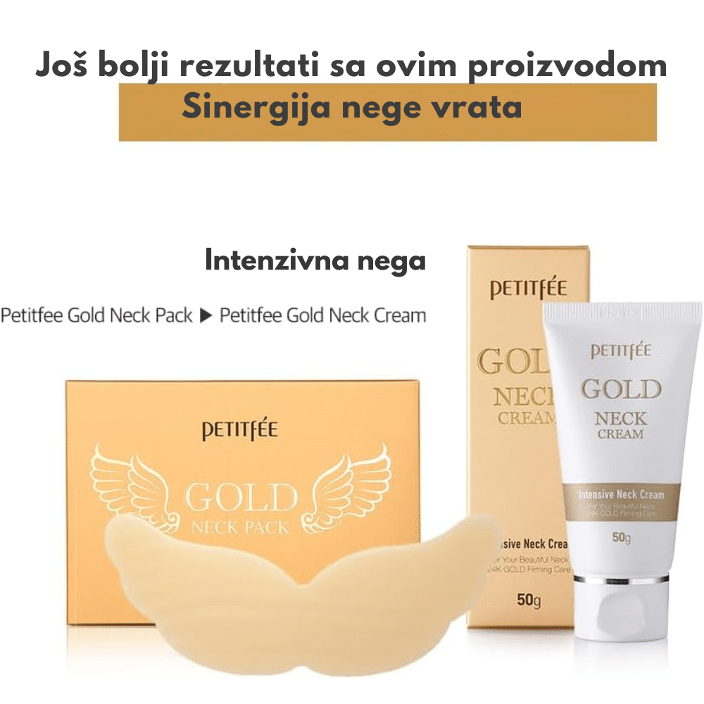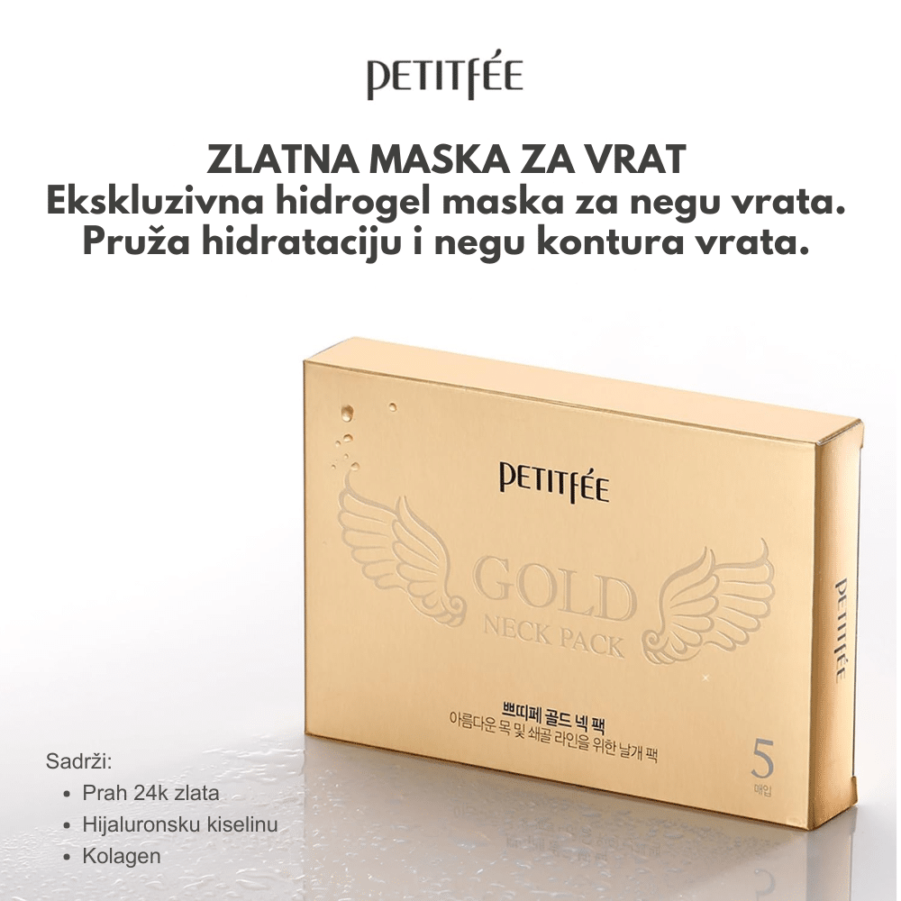 Petitfee Gold Neck Pack je luksuzna maska za vrat koja zateže, hidrira i revitalizuje kožu sklonu suvoći i opuštanju. Formulisana sa koloidnim zlatom, kolagenom i adenozinom, ova maska podstiče elastičnost i regeneraciju kože, smanjuje bore i vraća čvrstoću području vrata. Hijaluronska kiselina i ekstrakt aloe vere obezbeđuju dubinsku hidrataciju i umiruju, dok se hidrogel tekstura savršeno prilagođava koži i omogućava bolju apsorpciju aktivnih sastojaka. Rezultat je zaglađena, čvršća i blistava koža vrata.