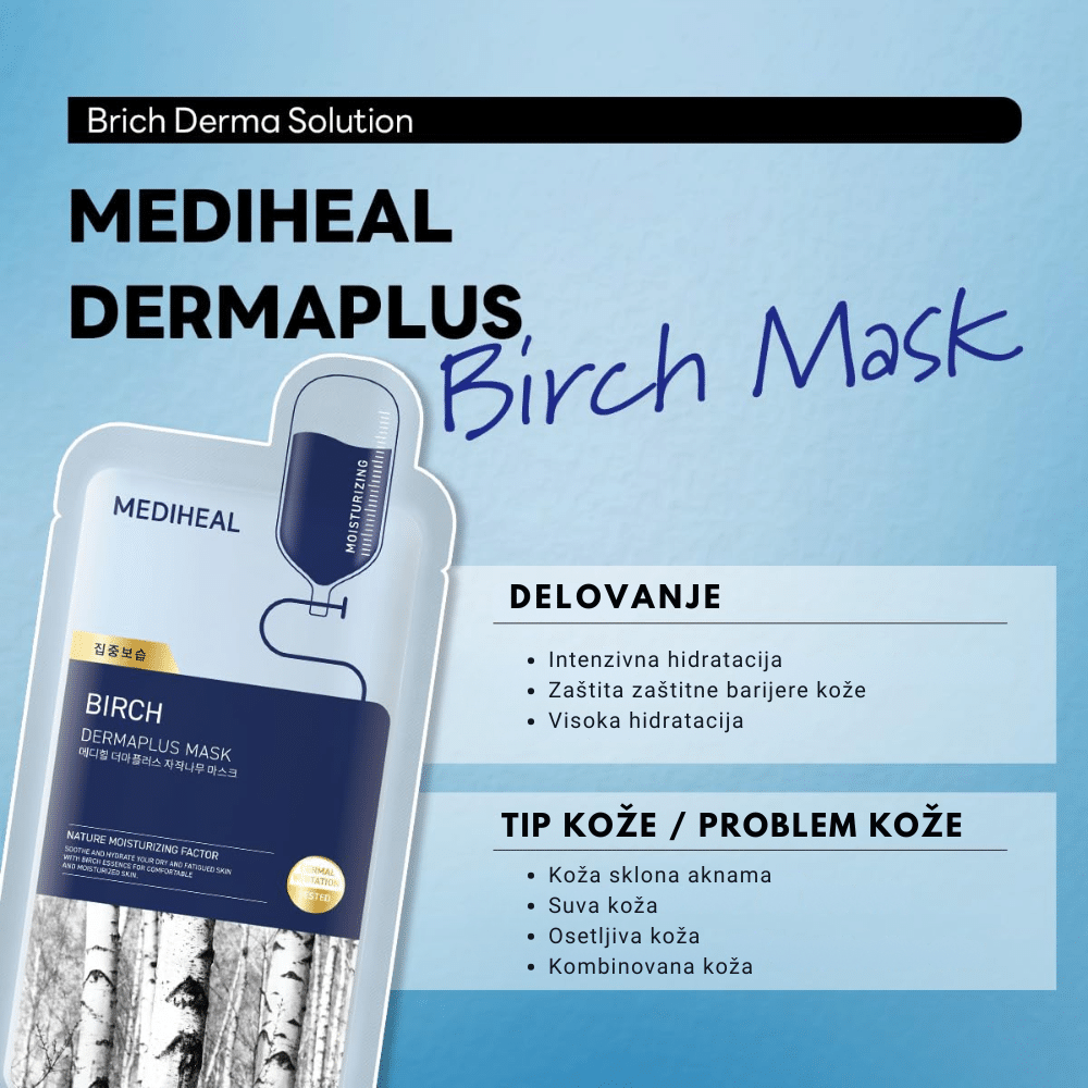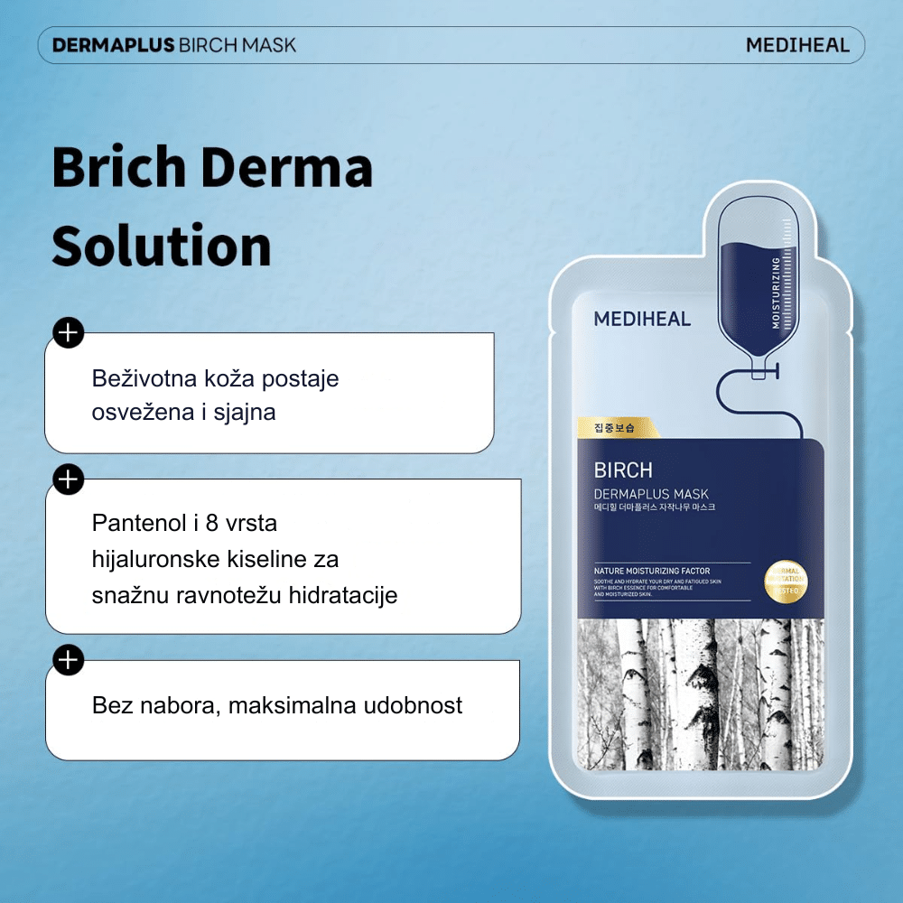 Mediheal Dermaplus Birch Mask je specijalizovani tretman za intenzivnu hidrataciju i pročišćavanje kože, baziran na blagotvornom soku breze (Betula Alba). Sok breze je u korejskoj kozmetici cenjen zbog svoje jedinstvene sposobnosti da dubinski hidrira ćelije kože, zahvaljujući bogatstvu aminokiselina, minerala i vitamina koji oponašaju prirodni sastav vlage u našem telu. Ova maska deluje kao moćan rezervoar vlage, sprečavajući isušivanje i umirujući upalne procese uzrokovane dehidratacijom. Lagana i osvežavajuća esencija brzo prodire u epidermis, ostavljajući kožu jedrom, mekom i vidno revitalizovanom. Dermaplus linija koristi hipoalergenu tkaninu koja minimalizuje iritacije, što ovu masku čini savršenom za kožu kojoj je potreban nežan, ali dubok oporavak. Redovnom upotrebom, ten postaje bistriji, tekstura kože se zaglađuje, a lice dobija onaj zdrav, prosvetljen izgled bez osećaja težine ili masnog sjaja.
