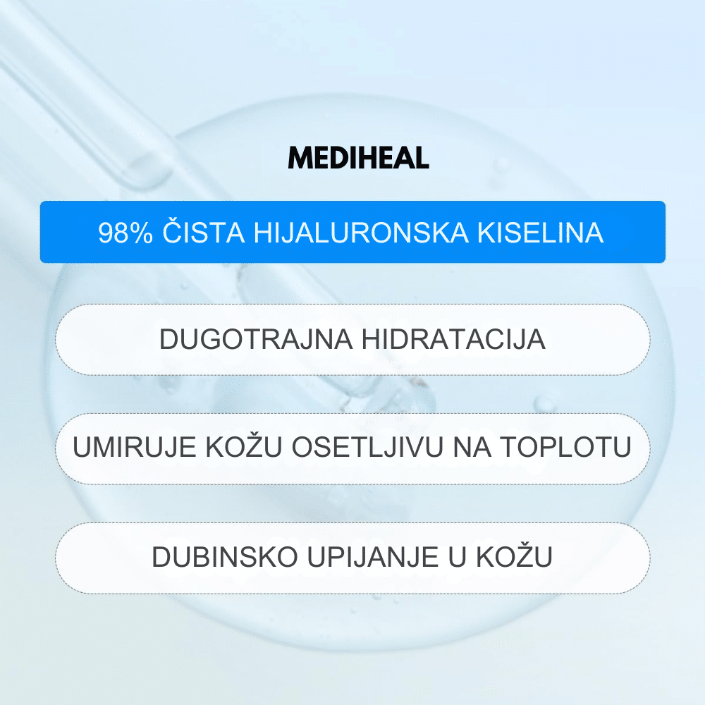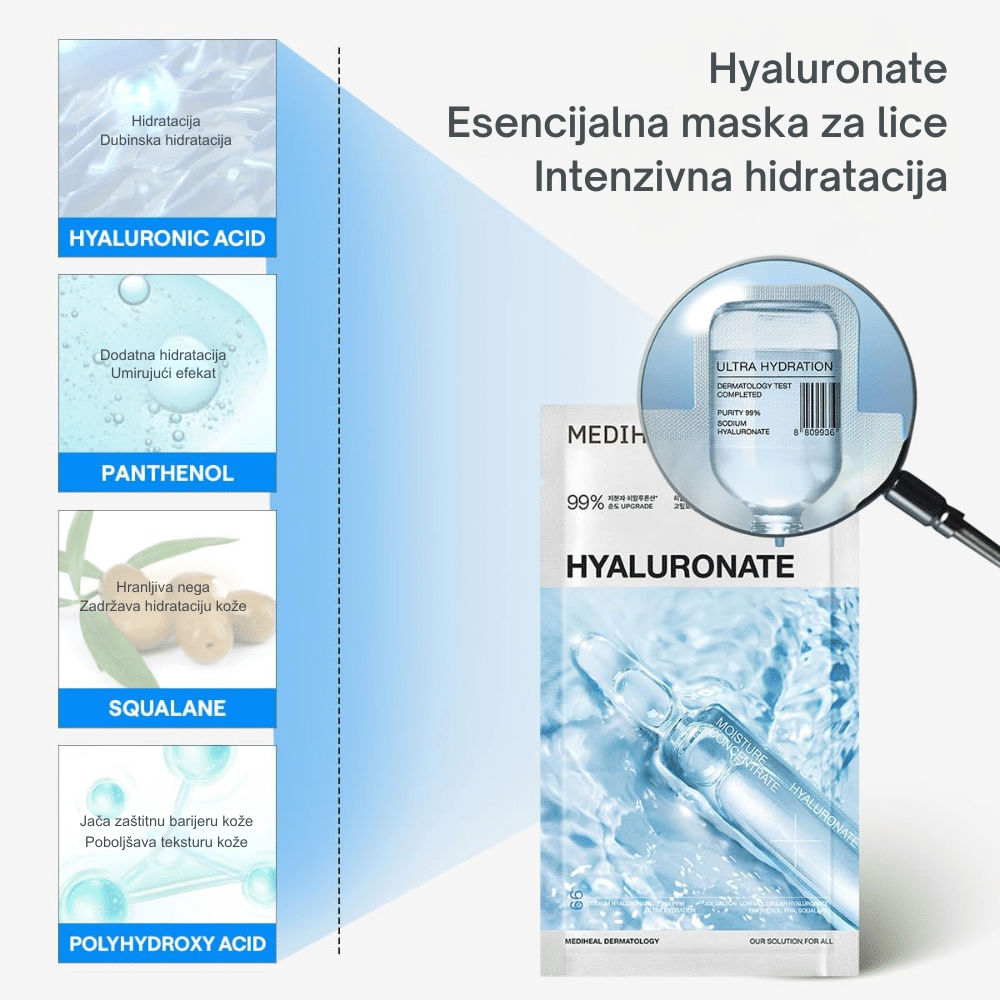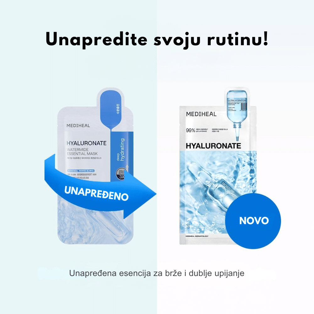 Mediheal Hyaluronate Essential Mask predstavlja vrhunsku “žednu pomoć” za kožu, dizajniranu da pruži intenzivnu i višeslojnu hidrataciju u samo jednom tretmanu. Ova maska koristi snagu kompleksa hijaluronske kiseline različitih molekularnih težina, koji prodiru u različite slojeve kože – od površine do dubljih struktura – obezbeđujući maksimalnu popunjenost i jedrost. Formula je kreirana tako da transformiše suvu i beživotnu kožu, ublažavajući fine linije nastale usled dehidratacije i vraćajući licu zdrav, orošen izgled (tzv. “dewy finish”). Materijal maske je ekološki prihvatljiva tkanina od bambusa koja ne samo da savršeno prianja uz svaku konturu lica, već deluje kao rezervoar koji postepeno i ravnomerno otpušta esenciju u kožu. Zahvaljujući dodatku umirujućih sastojaka, maska je izuzetno nežna, čineći je savršenom bazom pre važnih događaja ili kao oporavak nakon izlaganja agresivnim spoljnim faktorima poput vetra ili suvog vazduha u klimatizovanim prostorima.