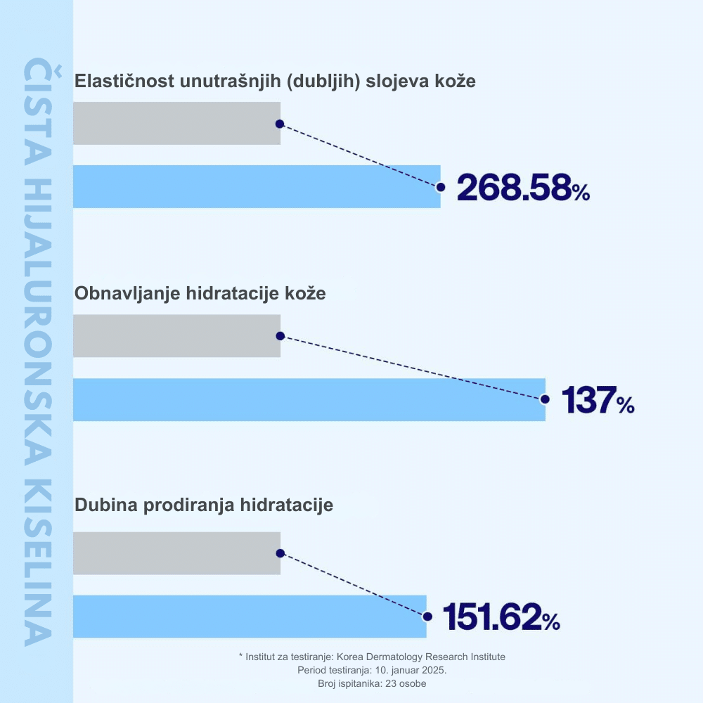 Hyaluronic Acid (Hijaluronska kiselina) je moćan humektant poznat po svojoj sposobnosti da veže i zadrži do 1000 puta više vode od svoje težine, čime intenzivno hidrira kožu. U kozmetici se koristi za poboljšanje elastičnosti, smanjenje finih linija i bora, kao i za postizanje punijeg, svežijeg i glatkog izgleda kože. Hijaluronska kiselina dolazi u različitim molekulskim veličinama – dok visokomolekularna hidrira površinski sloj kože, niskomolekularna prodire dublje i pruža dugotrajniju hidrataciju. Pogodna je za sve tipove kože, uključujući i osetljivu.