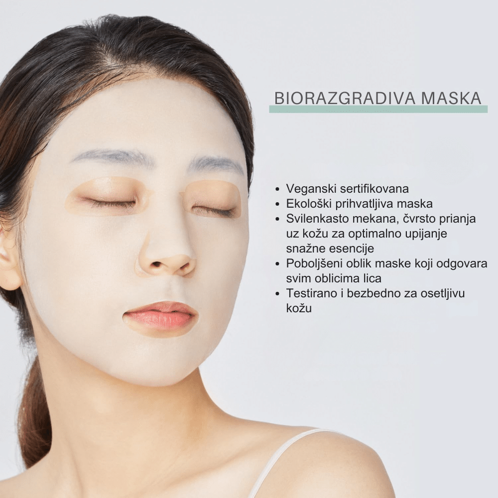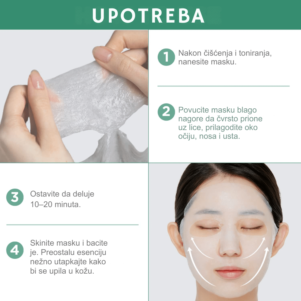 Nakon čišćenja lica i toniranja, izvadite masku iz pakovanja i postavite je na lice, prilagođavajući je predelu oko očiju i usta. Ostavite da deluje 10 do 20 minuta, a nakon uklanjanja, preostalu esenciju nežno utapkajte u kožu dlanovima dok se potpuno ne upije. Proizvod je namenjen isključivo za jednokratnu upotrebu; nemojte ga nanositi na kožu sa svežim postoperativnim ranama ili težim oblicima dermatitisa bez konsultacije sa lekarom. U slučaju pojave neuobičajenog peckanja ili osipa, odmah skinite masku i isperite lice hladnom vodom. Čuvajte na suvom i hladnom mestu, dalje od direktne sunčeve svetlosti.