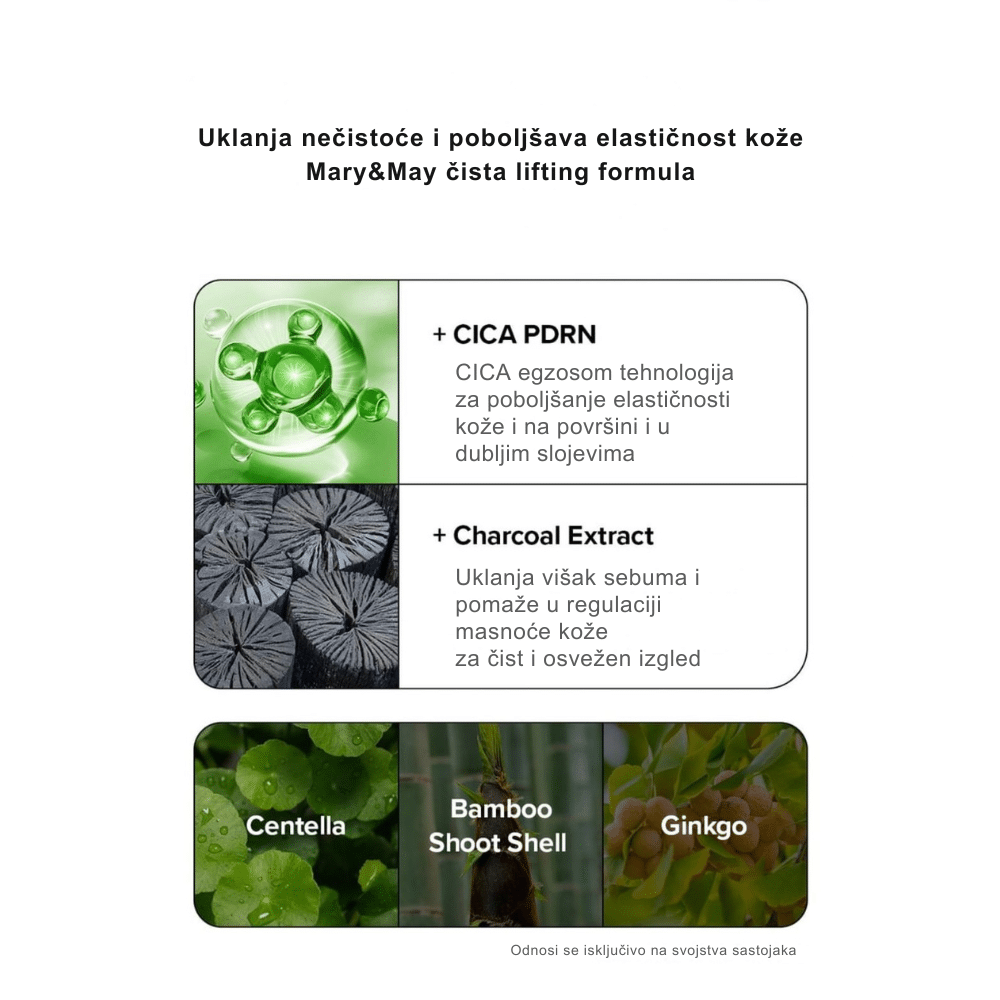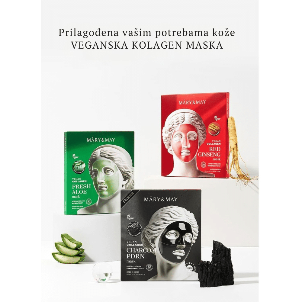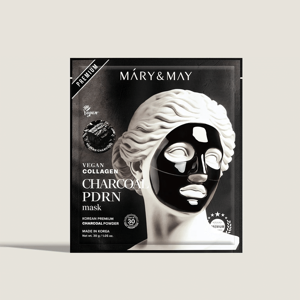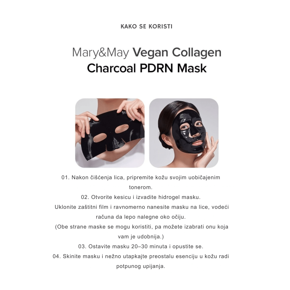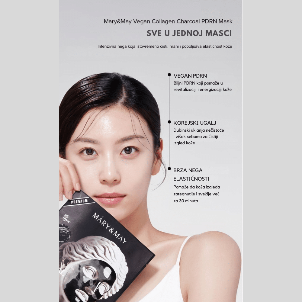 Mary&May Vegan Collagen Charcoal PDRN Mask predstavlja inovativno rešenje koje u jednom koraku dubinski čisti pore i pruža intenzivan anti-aging tretman. Ova specifična maska koristi moć aktivnog uglja (Charcoal) kako bi poput magneta izvukla nečistoće, višak sebuma i toksine iz pora, dok istovremeno zahvaljujući veganskom kolagenu i PDRN sastojku radi na učvršćivanju kože. PDRN, dobijen iz biljnih izvora u ovoj veganskoj varijanti, poznat je po svojoj neverovatnoj sposobnosti da regeneriše ćelije i popravi teksturu kože, čineći je elastičnom i glatkom. Za razliku od običnih maski sa ugljem koje mogu isušiti lice, Mary&May je formulisala ovu masku tako da zadrži vlažnost unutar barijere. Crna boja maske potiče od prirodnog uglja koji pročišćava ten, dok biljni kolagen niske molekularne težine popunjava fine linije. Rezultat je savršeno čista, matirana koža koja istovremeno izgleda jedro, zategnuto i revitalizovano. Idealna je za postizanje efekta suženih pora i “liftinga” u udobnosti doma, ostavljajući kožu mekanom i vidno osveženom bez osećaja zatezanja