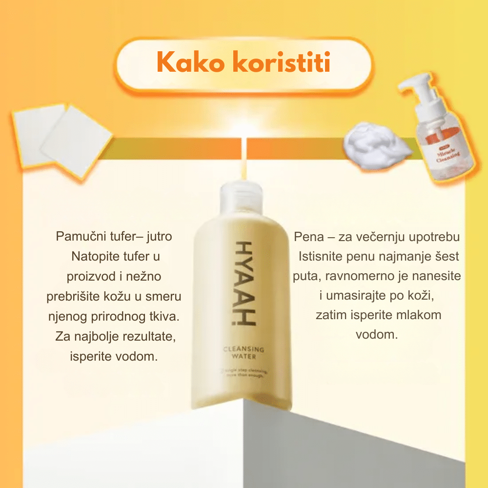 Nanesite odgovarajuću količinu HYAAH Mild But Deep Cleansing Water na pamučni tufer i nežno obrišite lice, uključujući područje oko očiju i usana, kako biste uklonili šminku i nečistoće. Nije potrebno ispiranje, ali po želji možete nastaviti sa uobičajenom rutinom čišćenja lica. Koristite ujutru i uveče. U slučaju iritacije, prekinite upotrebu i konsultujte se sa dermatologom.