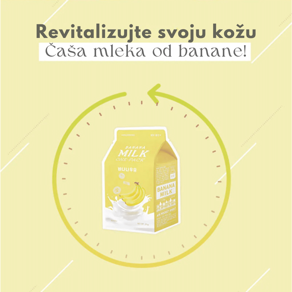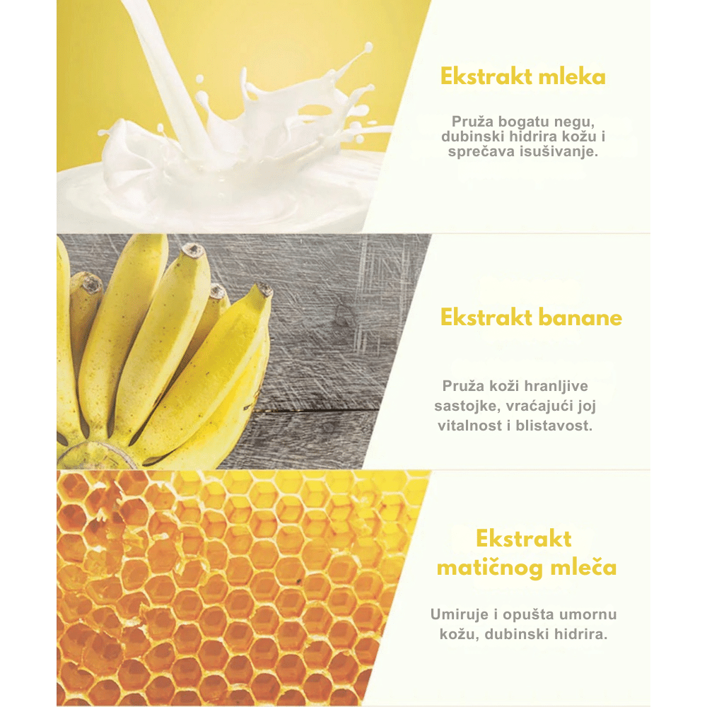 Sheet maska sa ekstraktom banane i mlečnim proteinima koja hidrira, hrani i obnavlja kožu, ostavljajući je glatkom i blistavom.