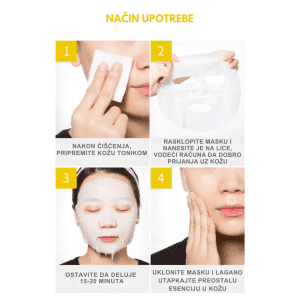 Nakon čišćenja i toniranja lica, pažljivo nanesite masku na celo lice, izbegavajući područje oko očiju. Ostavite masku da deluje 15-20 minuta, a zatim je uklonite. Nema potrebe za ispiranjem, ostatak seruma možete nežno utapkati u kožu.