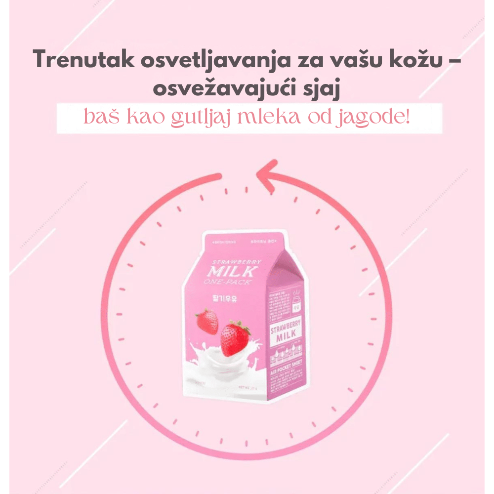 A’PIEU Milk One Pack #Strawberry Milk Sheet maska je hidratantna maska za lice dizajnirana da pruži intenzivnu hidrataciju i posvetli ten. Obogaćena ekstraktom jagode, bogatim vitaminom C i antioksidansima, ova maska pomaže u posvetljivanju kože i ujednačavanju tena, dok mlečni ekstrakt stvara zaštitnu barijeru koja zadržava vlagu, ostavljajući kožu mekom i glatkom. Inovativna tehnologija vazdušnih džepova omogućava optimalnu apsorpciju aktivnih sastojaka, pružajući maksimalne rezultate. Ova maska je pogodna za sve tipove kože, posebno za one koji traže osveženje i revitalizaciju umorne i beživotne kože.