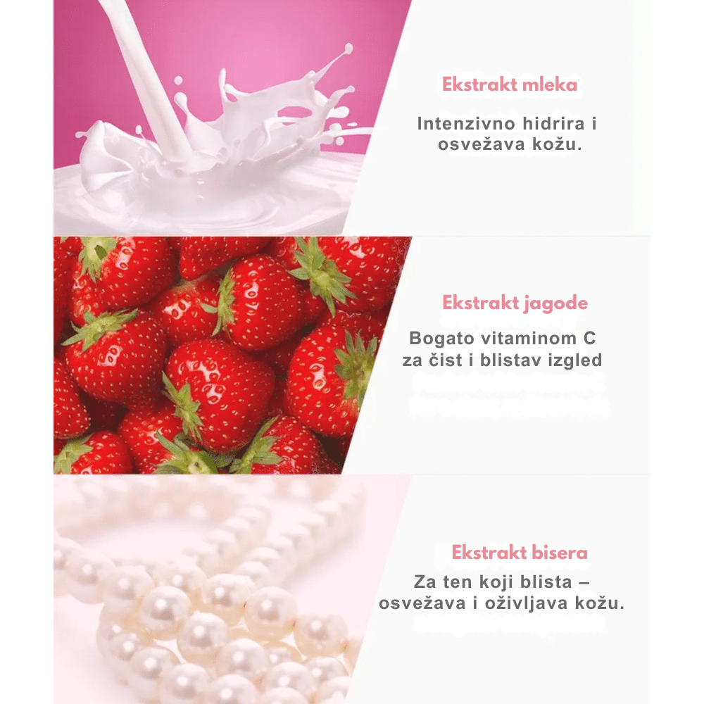 Water, Butylene Glycol, Glycerin, Mineral Oil, PEG-40 Stearate, Cetearyl Alcohol, Stearic Acid, Sorbitan Sesquioleate, Fragaria Chiloensis (Strawberry) Fruit Extract, Milk Extract, Pearl Extract, Lactobacillus/Soybean Ferment Extract, Saccharomyces/Imperata Cylindrica Root Ferment Extract, Saccharomyces/Viscum Album (Mistletoe) Ferment Extract, Nelumbo Nucifera Callus Culture Extract, 1,2-Hexanediol, Sodium Hyaluronate, Ethylhexylglycerin, Caprylyl Glycol, Illicium Verum (Anise) Fruit Extract, Carbomer, Triethanolamine, Phenoxyethanol, Disodium EDTA, Fragrance