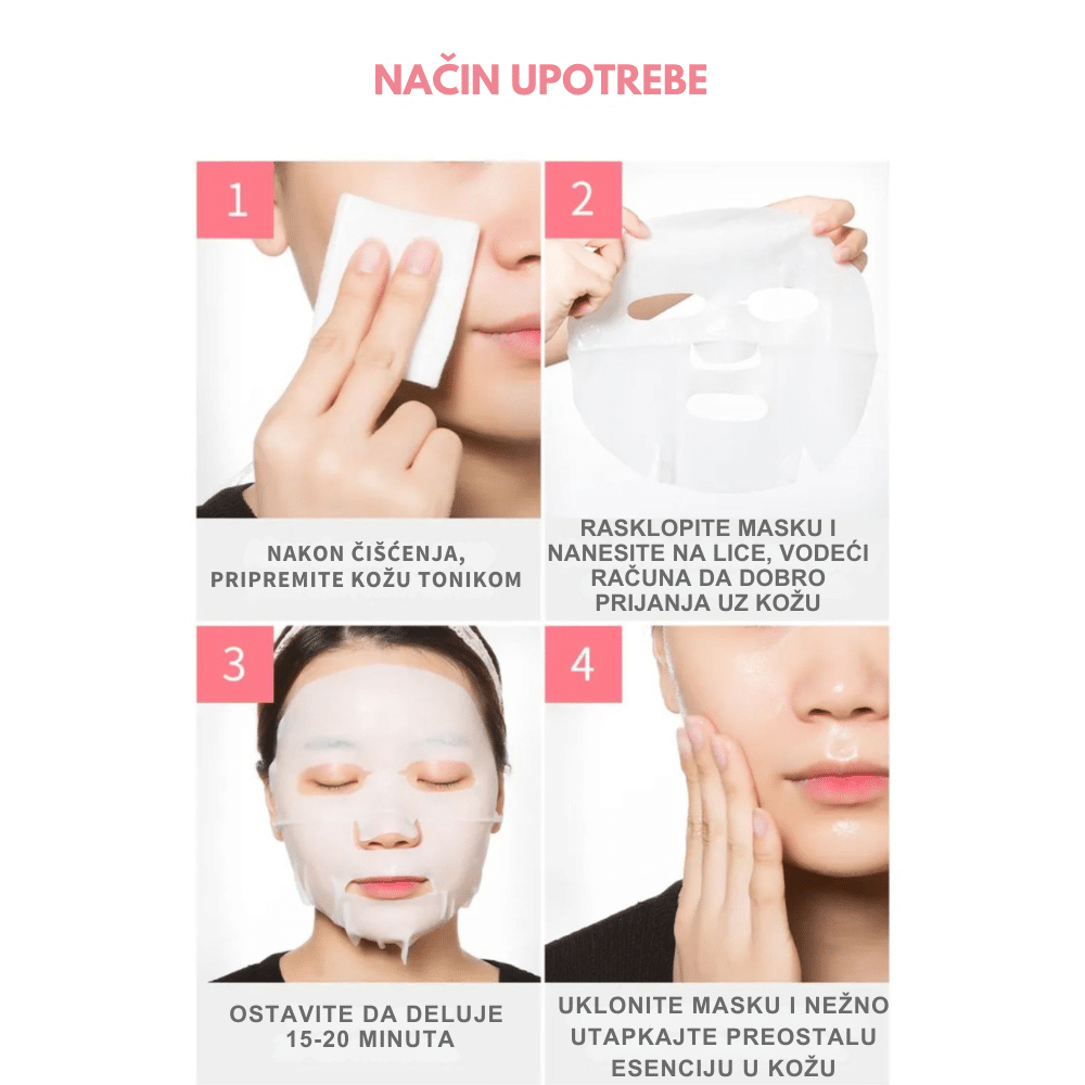 Nakon čišćenja i toniranja lica, pažljivo izvadite masku iz pakovanja i postavite je ravnomerno na lice, izbegavajući područje oko očiju i usana. Ostavite da deluje 10-20 minuta, omogućavajući koži da upije esenciju. Nakon uklanjanja maske, nežno utapkajte preostalu esenciju u kožu dok se potpuno ne upije. Preporučuje se upotreba 2-3 puta nedeljno za optimalne rezultate. Izbegavajte upotrebu na iritiranoj ili oštećenoj koži. U slučaju iritacije, prekinite upotrebu i konsultujte dermatologa.