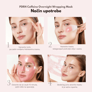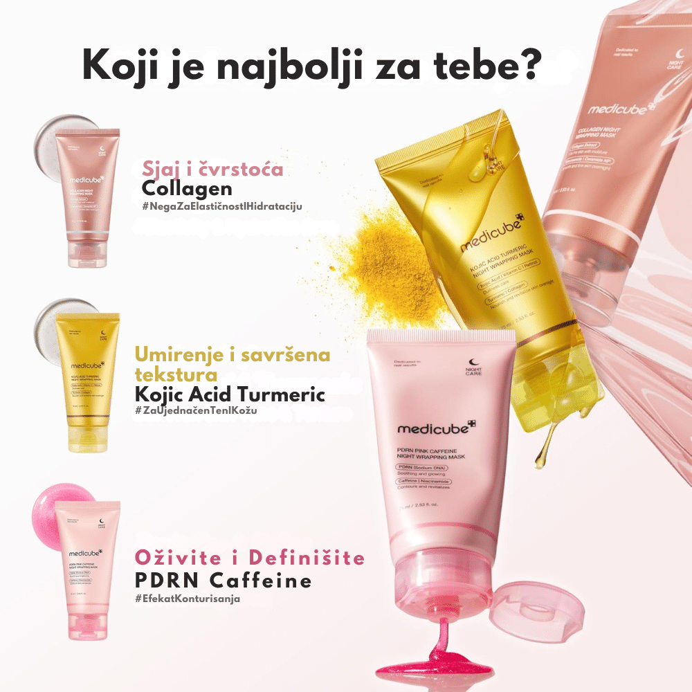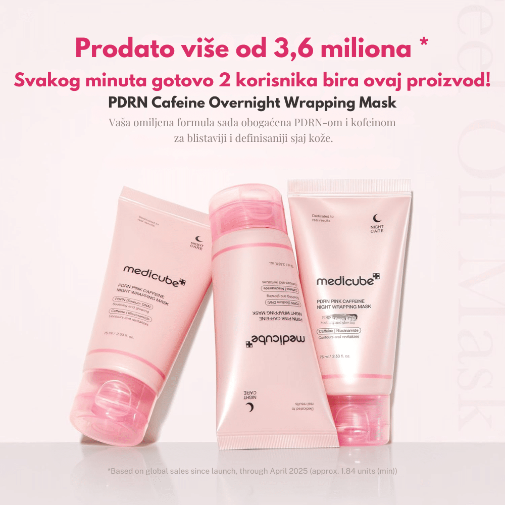 Medicube PDRN Pink Caffeine Night Wrapping Mask je noćna maska-film koja kombinuje regenerativni PDRN (polideoksiribonukleotid), kofein i hijaluronsku kiselinu, a formulisana je da tokom noći zategne konture lica, osveži umoran ten i intenzivno hidrira kožu.