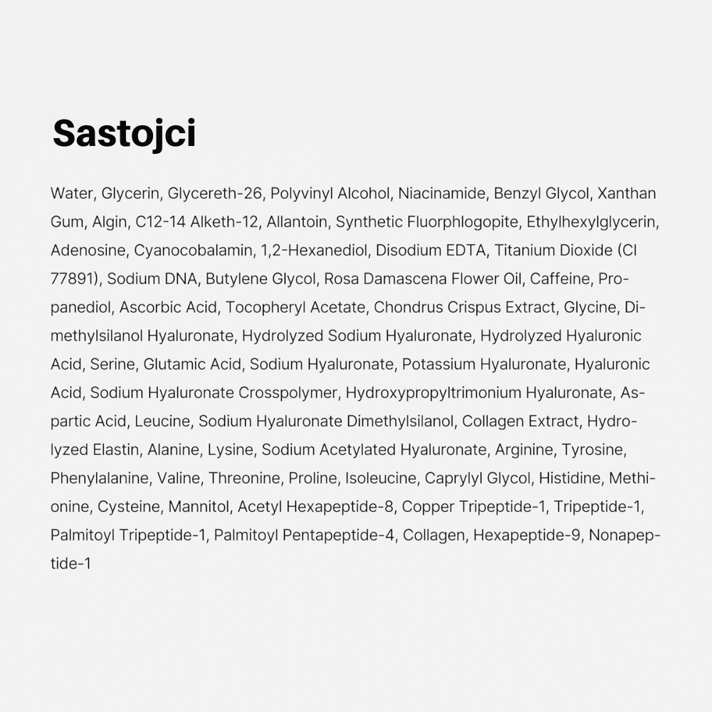 Water (Aqua), Glycerin, Glycereth-26, Polyvinyl Alcohol, Niacinamide, Benzyl Glycol, Xanthan Gum, Algin, C12-14 Alketh-12, Allantoin, Synthetic Fluorphlogopite, Ethylhexylglycerin, Adenosine, Cyanocobalamin, 1,2-Hexanediol, Disodium EDTA, Titanium Dioxide (CI 77891), Sodium DNA (PDRN), Butylene Glycol, Rosa Damascena Flower Oil, Caffeine, Propanediol, Ascorbic Acid, Tocopheryl Acetate, Chondrus Crispus Extract, Glycine, Dimethylsilanol Hyaluronate, Hydrolyzed Sodium Hyaluronate, Hydrolyzed Hyaluronic Acid, Serine, Glutamic Acid, Sodium Hyaluronate, Potassium Hyaluronate, Hyaluronic Acid, Sodium Hyaluronate Crosspolymer, Hydroxypropyltrimonium Hyaluronate, Aspartic Acid, Leucine, Sodium Hyaluronate Dimethylsilanol, Collagen Extract, Hydrolyzed Elastin, Alanine, Lysine, Sodium Acetylated Hyaluronate, Arginine, Tyrosine, Phenylalanine, Valine, Threonine, Proline, Isoleucine, Caprylyl Glycol, Histidine, Methionine, Cysteine, Mannitol, Acetyl Hexapeptide-8, Copper Tripeptide-1, Tripeptide-1, Palmitoyl Tripeptide-1, Palmitoyl Pentapeptide-4, Collagen, Hexapeptide-9, Nonapeptide-1.