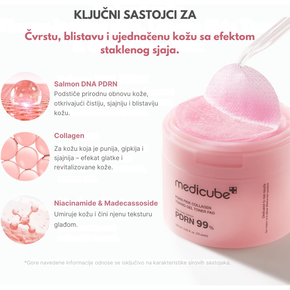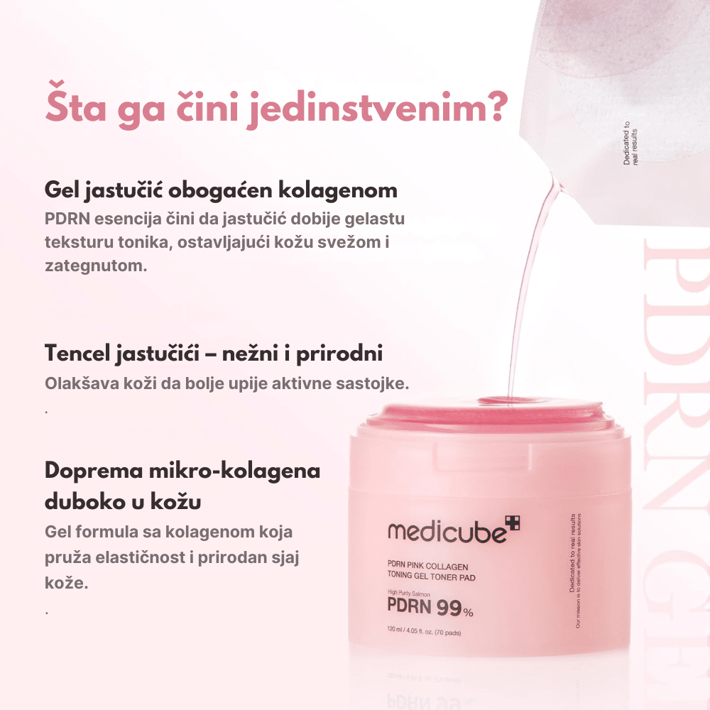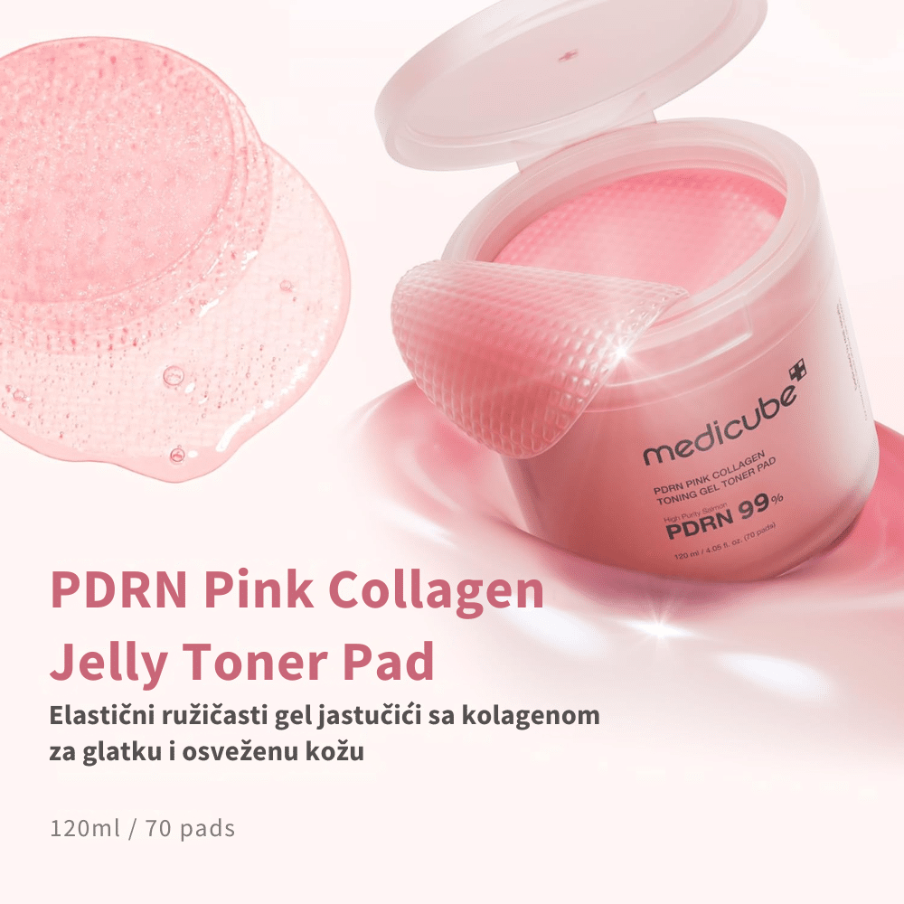 Medicube PDRN Pink Collagen Toning Gel Toner Pad je inovativni gel-toner u formi jastučića natopljenih esencijom sa PDRN-om (iz DNA izvora), niacinamidom i kolagenom — namenjen sužavanju pora, jačanju barijere kože i postizanju glatkije, čvršće i blistavije kože uz minimalan napor.