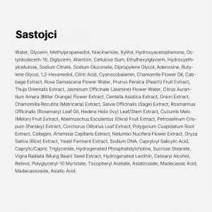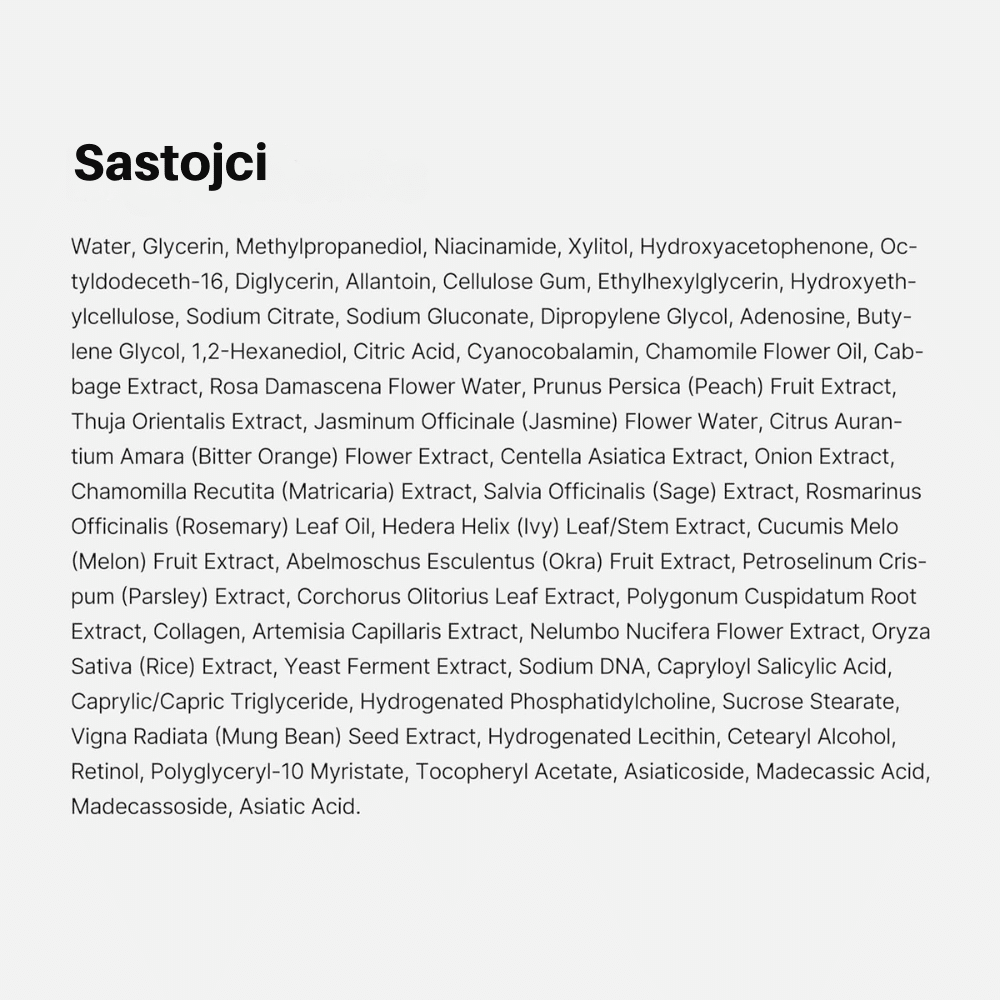 Water (Aqua), Glycerin, Methylpropanediol, Niacinamide, Xylitol, Hydroxyacetophenone, Octyldodeceth-16, Diglycerin, Allantoin, Cellulose Gum, Ethylhexylglycerin, Hydroxyethylcellulose, Sodium Citrate, Sodium Gluconate, Dipropylene Glycol, Adenosine, Butylene Glycol, 1,2-Hexanediol, Citric Acid, Cyanocobalamin, Anthemis Nobilis Flower Oil, Pyrus Communis (Pear) Fruit Extract, Rosa Damascena Flower Water, Prunus Persica (Peach) Fruit Extract, Thuja Orientalis Extract, Jasminum Officinale Flower Water, Citrus Aurantium Amara Flower Extract, Centella Asiatica Extract, Allium Cepa (Onion) Bulb Extract, Chamomilla Recutita (Matricaria) Extract, Salvia Officinalis (Sage) Extract, Rosmarinus Officinalis Leaf Oil, Hedera Helix Leaf/Stem Extract, Cucumis Melo (Melon) Fruit Extract, Hibiscus Esculentus Fruit Extract, Carum Petroselinum (Parsley) Extract, Corchorus Olitorius Leaf Extract, Polygonum Cuspidatum Root Extract, Collagen, Artemisia Annu­a Extract, Nelumbium Speciosum Flower Extract, Oryza Sativa (Rice) Extract, Saccharomyces Ferment, Sodium DNA, Capryloyl Salicylic Acid, Caprylic/Capric Triglyceride, Hydrogenated Phosphatidylcholine, Sucrose Stearate, Phaseolus Radiatus Seed Extract, Hydrogenated Lecithin, Cetearyl Alcohol, Retinol, Polyglyceryl-10 Myristate, Tocopheryl Acetate, Asiaticoside, Madecassic Acid, Madecassoside, Asiatic Acid.