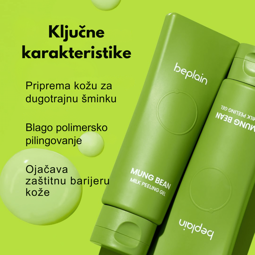 Beplain Mung Bean Milk Peeling Gel je blagi gel-peeling sa ekstraktom zelenog pasulja i sojinog mleka koji nežno uklanja mrtve ćelije kože, dok istovremeno hidrira i jača barijeru kože za čistiju i glatkiju teksturu.