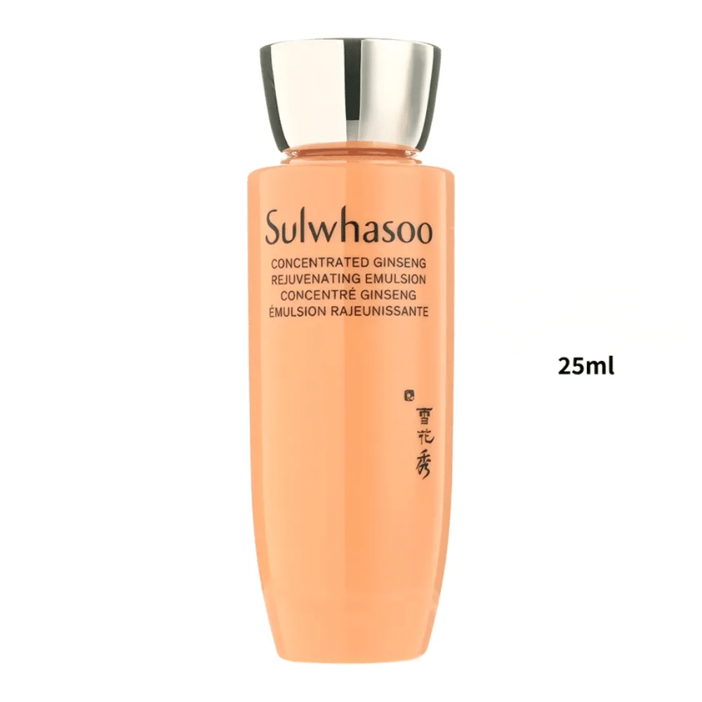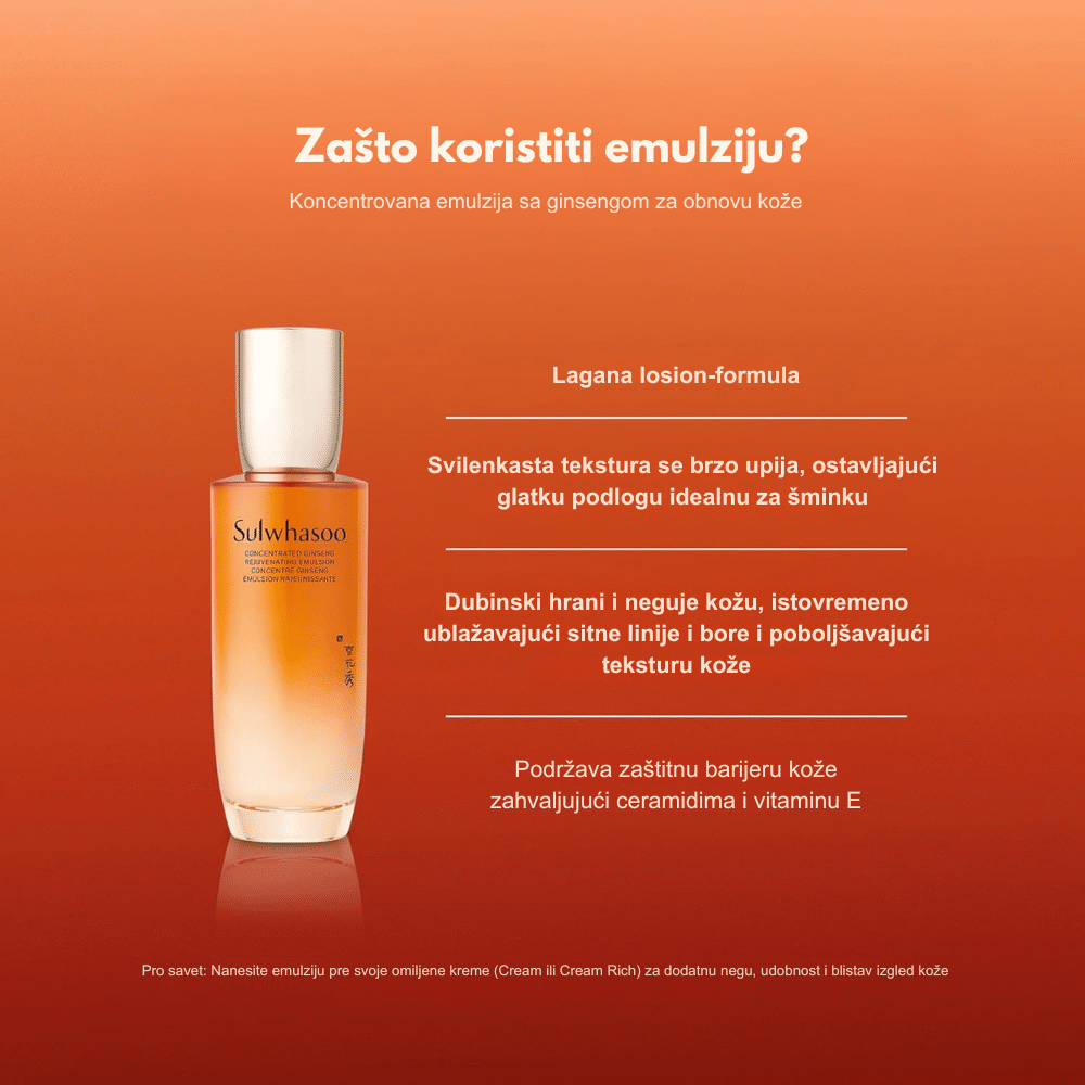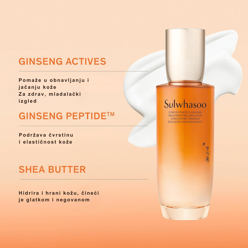 Sulwhasoo Concentrated Ginseng Rejuvenating Emulsion Mini 25 ml je luksuzna mlečna emulzija za lice koja kombinuje patentiranu tehnologiju ginsenga („Ginsenomics™“), peptidni kompleks i shea puter kako bi vidljivo poboljšala elastičnost kože, zagladila bore i pružila bogatu hidrataciju bez masnog osećaja.